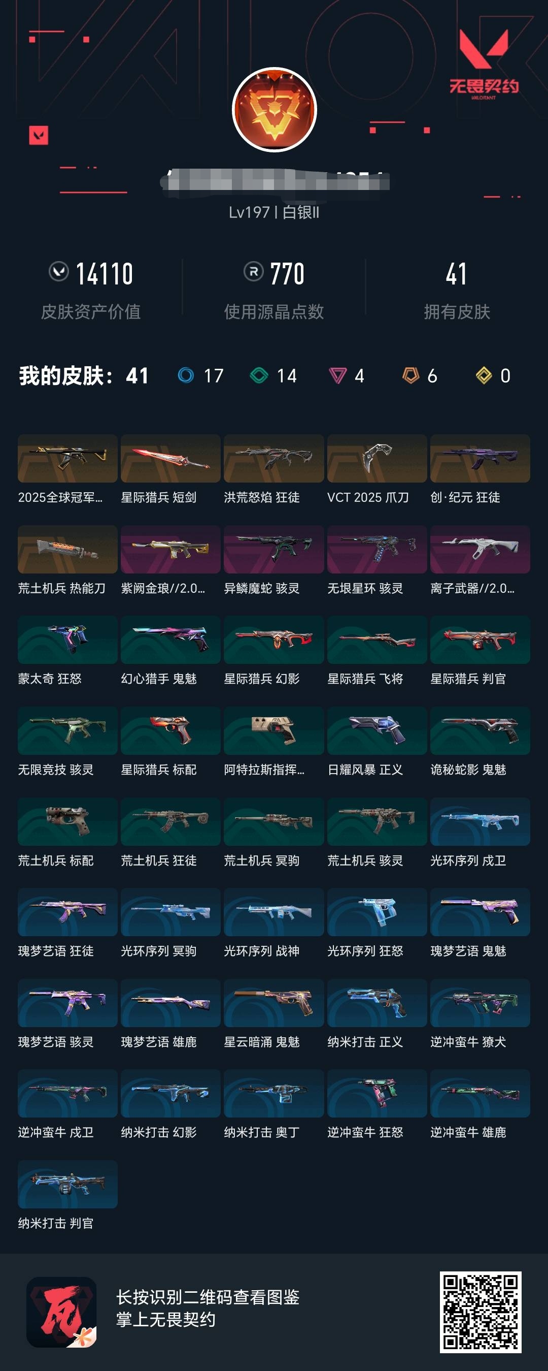 MWW549【2025冠军狂徒 爪刀 洪荒狂徒 创纪元狂徒】【游戏等级】Lv197 【段位】 白银II 【R点】770 【皮肤总价值】14,110 【英雄数量】26 【皮肤数量】41 【挂饰数量】79 【卡面数量】93 【喷漆数量】68 【狂怒】狂怒-蒙太奇 狂怒-光环序列 狂怒-逆冲蛮牛 【鬼魅】鬼魅-幻心猎手 鬼魅-瑰梦艺语 鬼魅-诡秘蛇影 鬼魅-星云暗涌 【幻影】幻影-紫阙金琅//2.0 幻影-星际猎兵 幻影-纳米打击 【骇灵】骇灵-异鳞魔蛇 骇灵-无垠星环 骇灵-瑰梦艺语 骇灵-无限竞