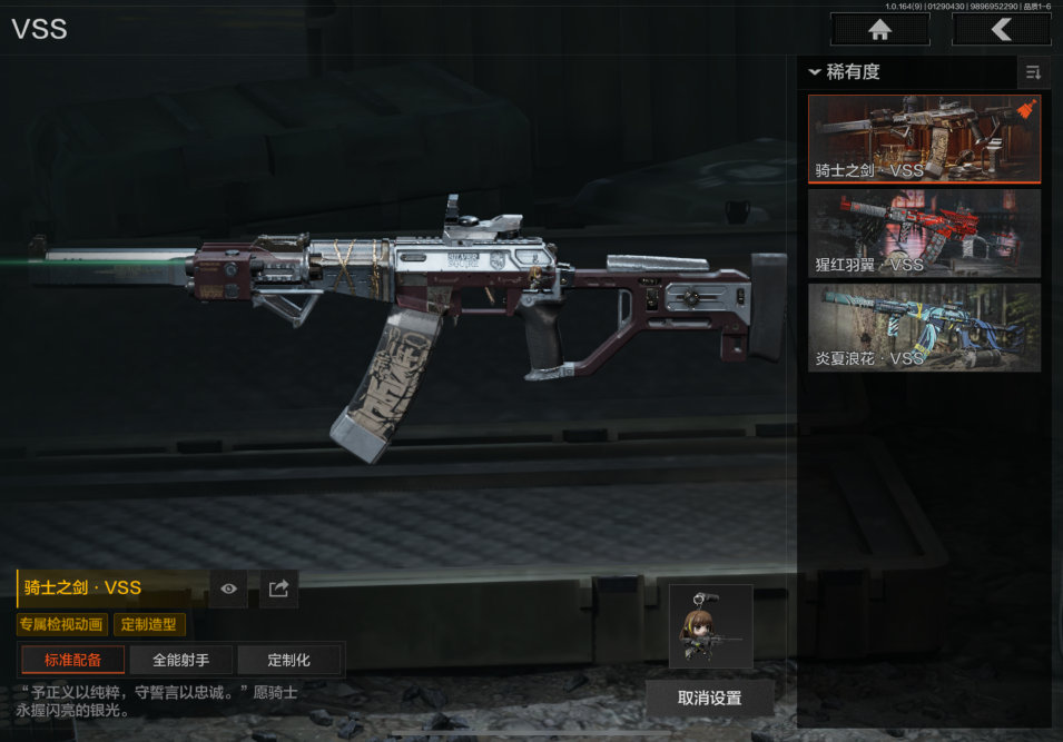 苹果Q-等级30-仓库价值241.3-科恩币5285-【枪皮】骑士之剑VSS【近