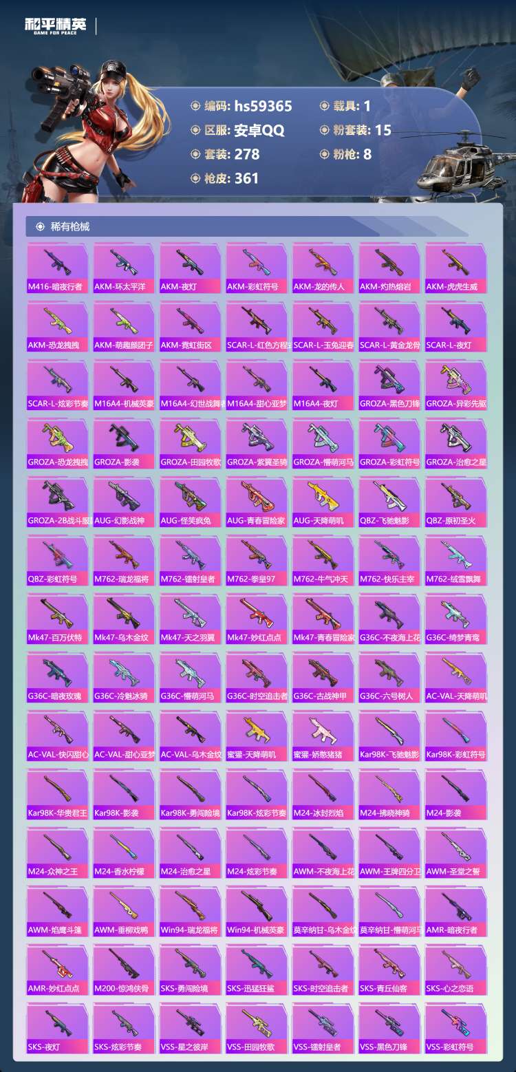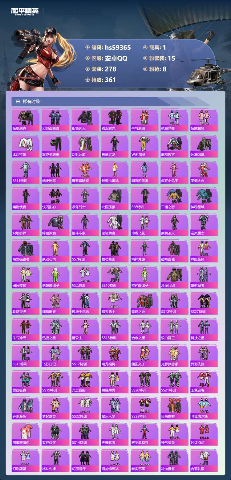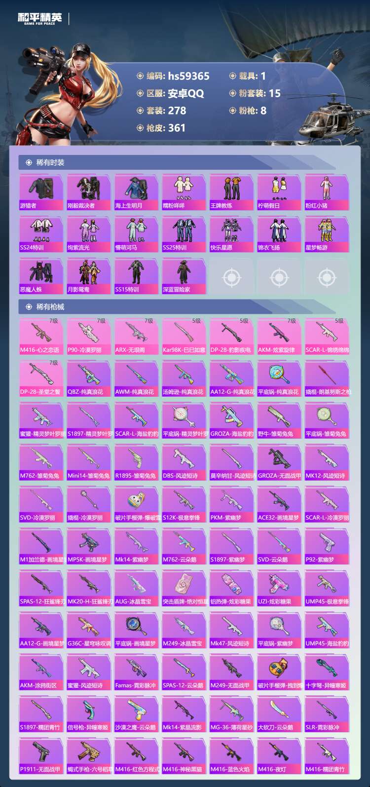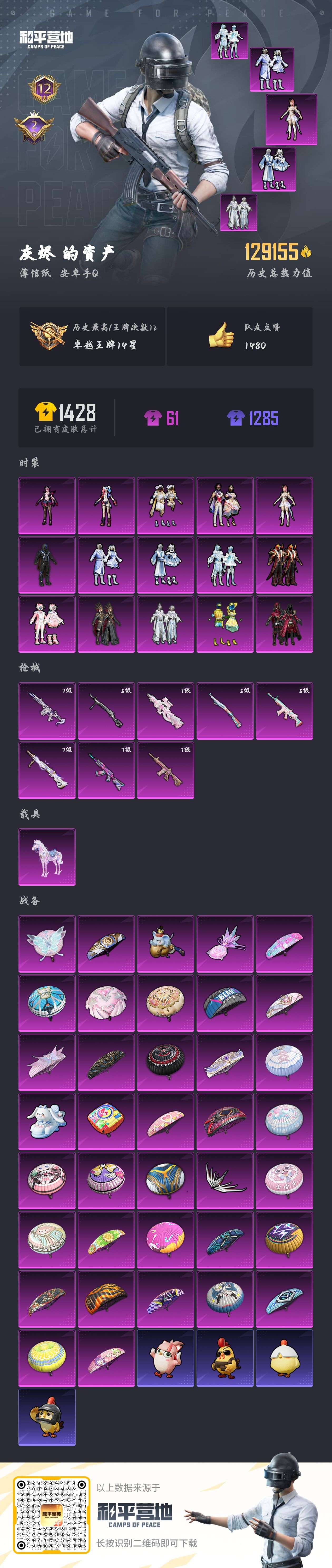 安卓手Q-12王牌印记-15粉装-8特效枪-1载具-129245热力值-278套装-361枪皮-2卓