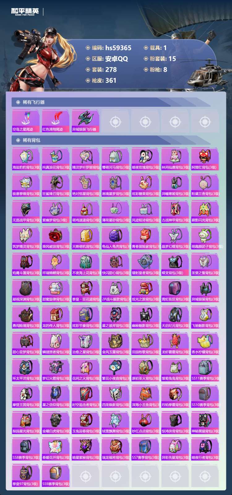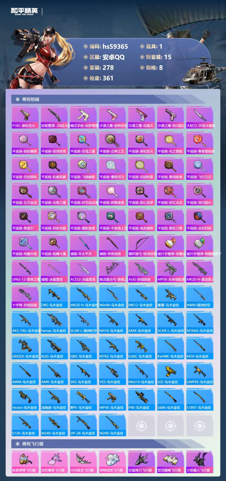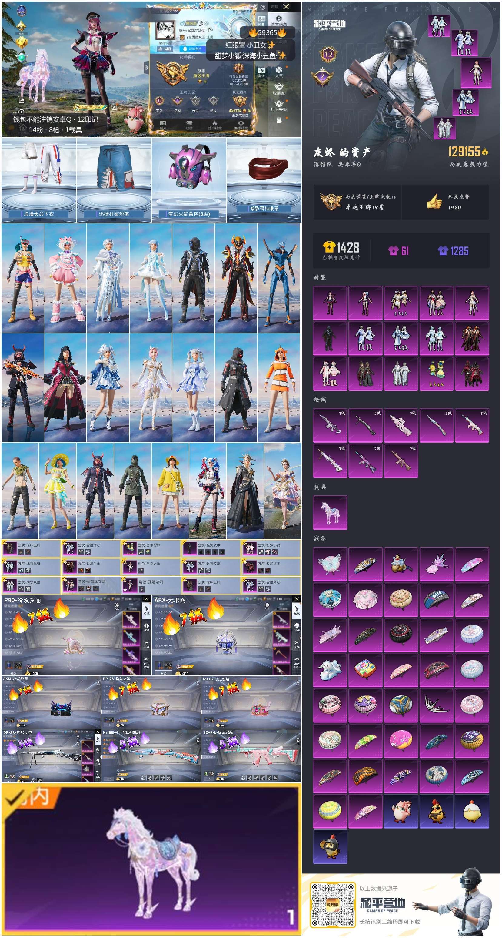 安卓手Q-12王牌印记-15粉装-8特效枪-1载具-129245热力值-278套装-361枪皮-2卓
