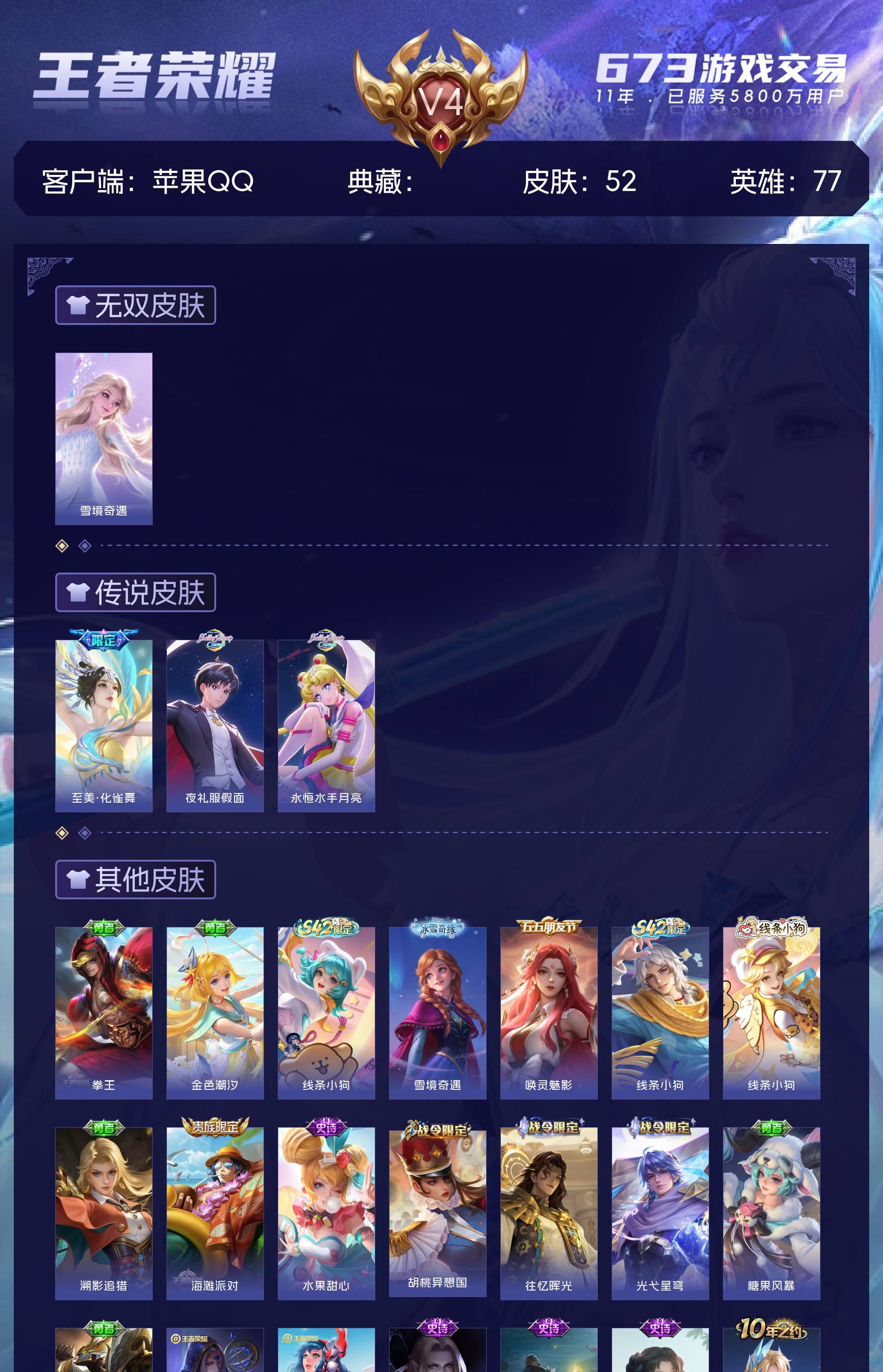 V4 皮肤52 英雄77 永恒钻石 无双皮肤1 传说3 其他皮肤51