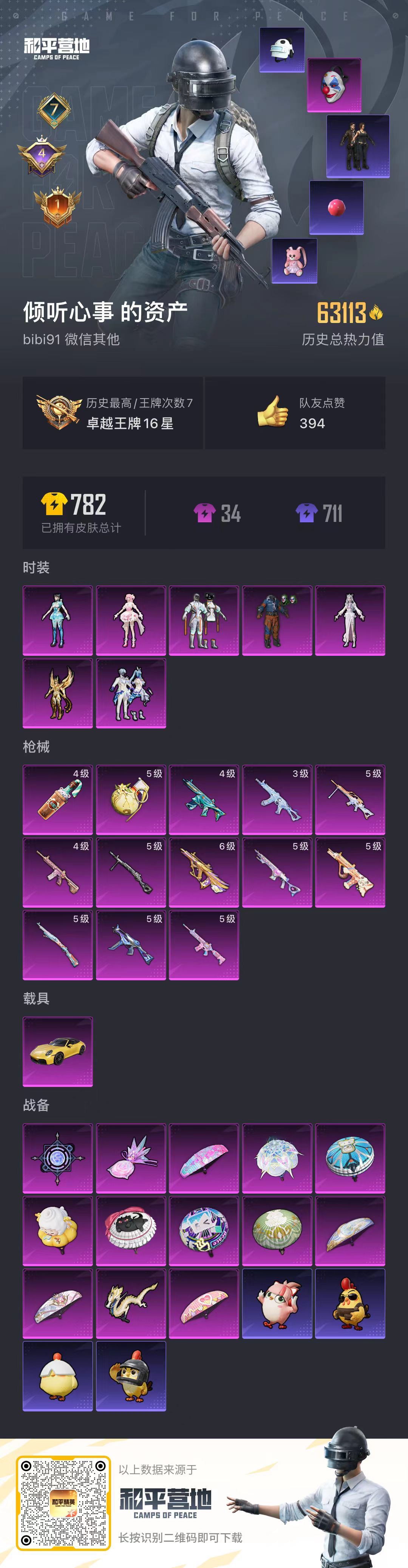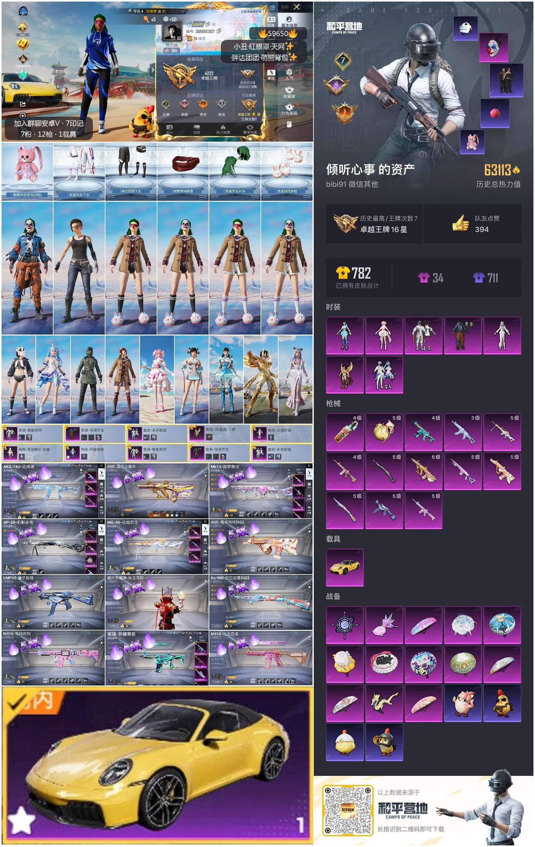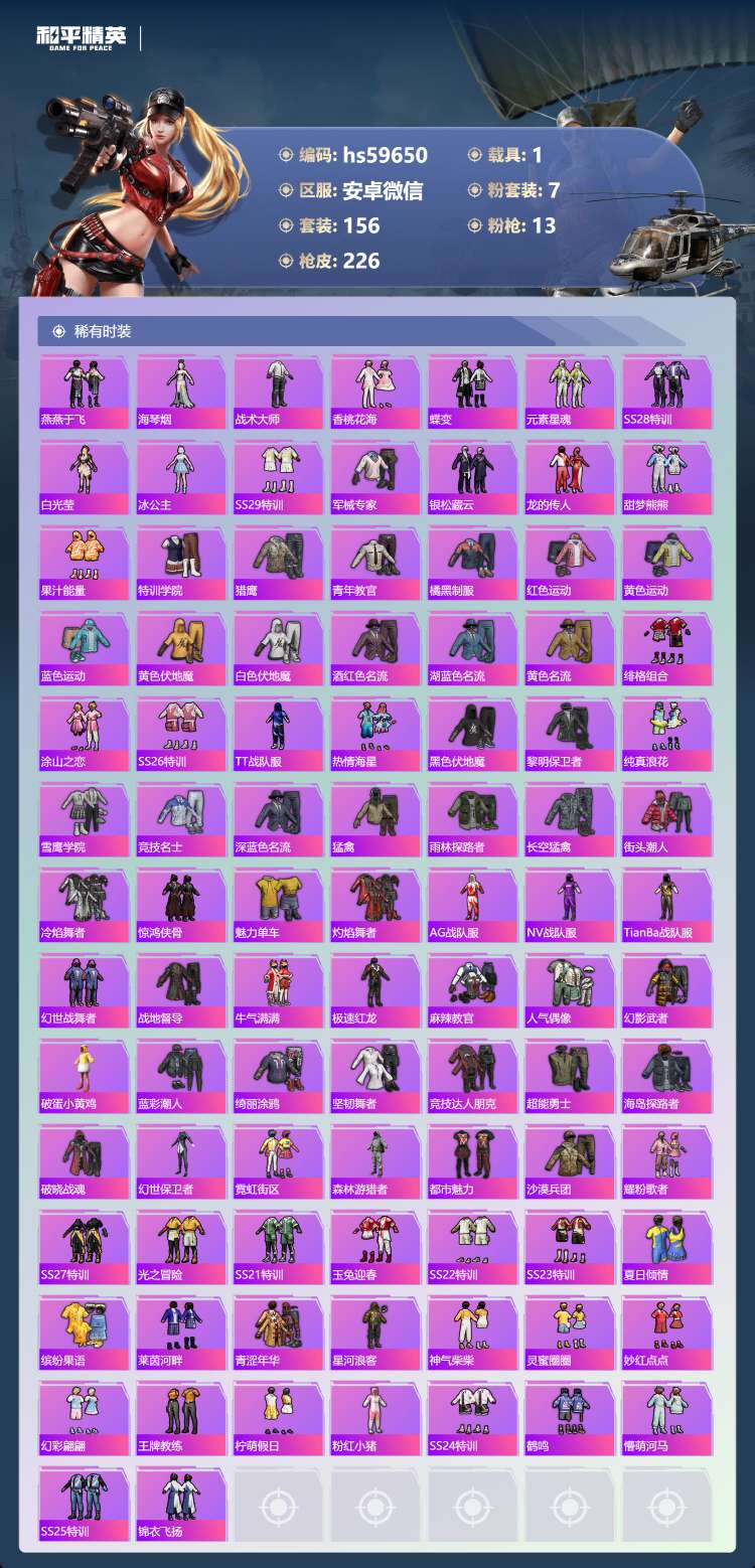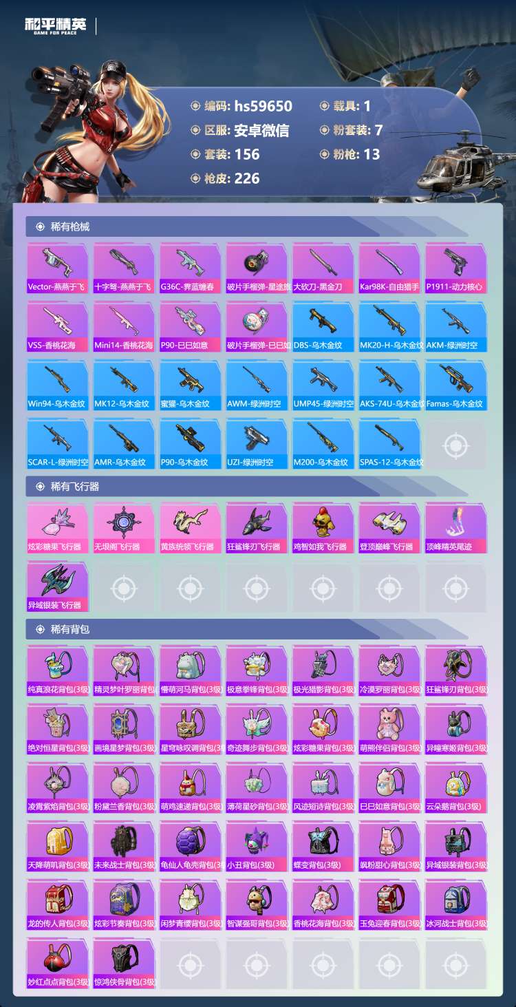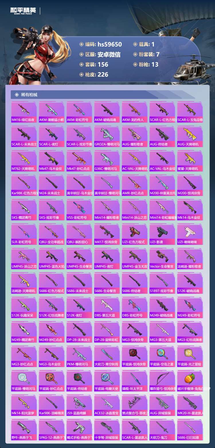 hs59650 安卓微-7王牌印记-7粉装-13特效枪-1载具-63113热力值-156套装-22