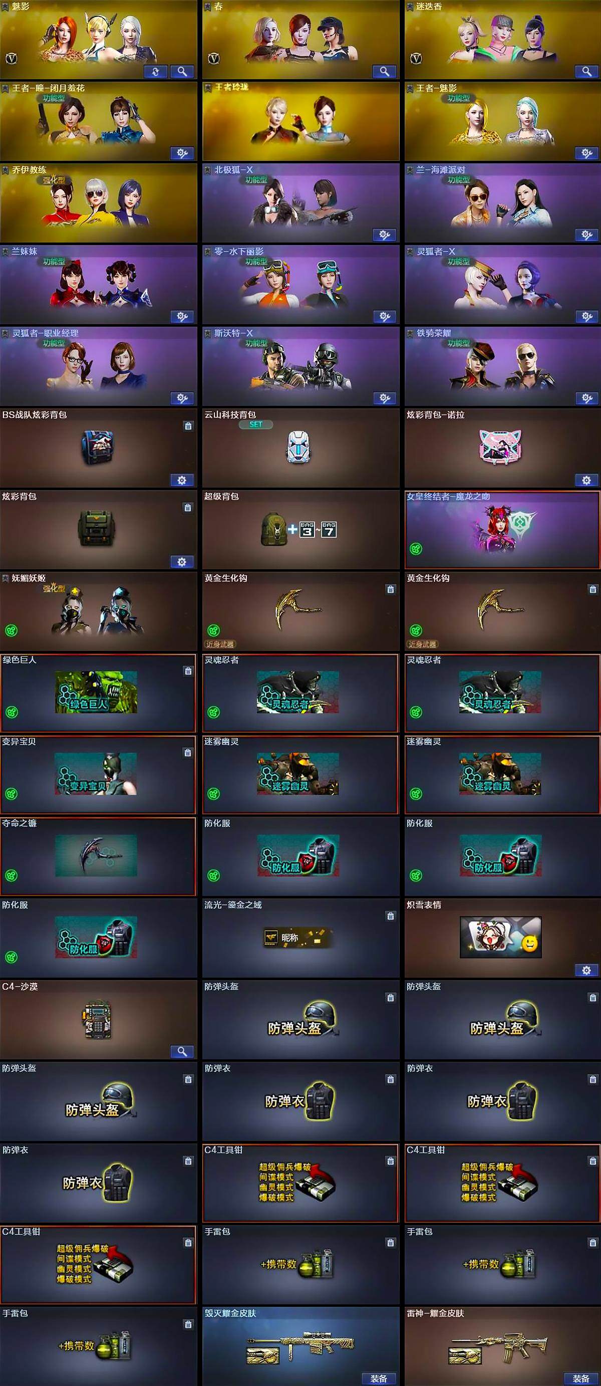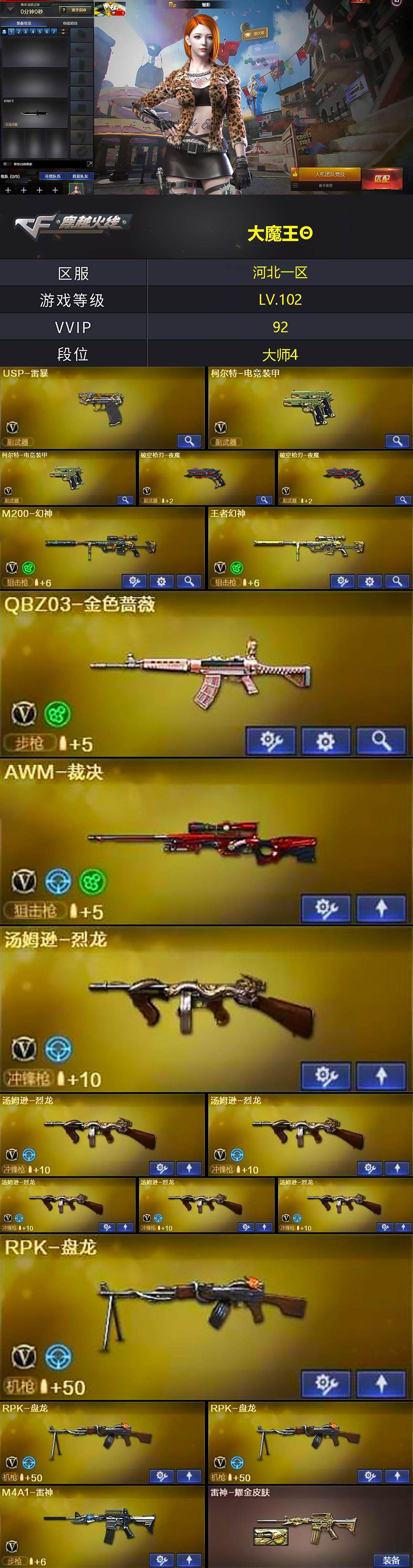 【热门武器】:QBZ03-金色蔷薇,HK417-朱雀,M200-幻神,死亡之眼,M4A1-黑骑士*3,汤姆逊-烈龙*6,RPK-盘龙*3,加特林-炼狱*4,斯泰尔-蝴蝶,USP-雷暴,沙鹰-修罗