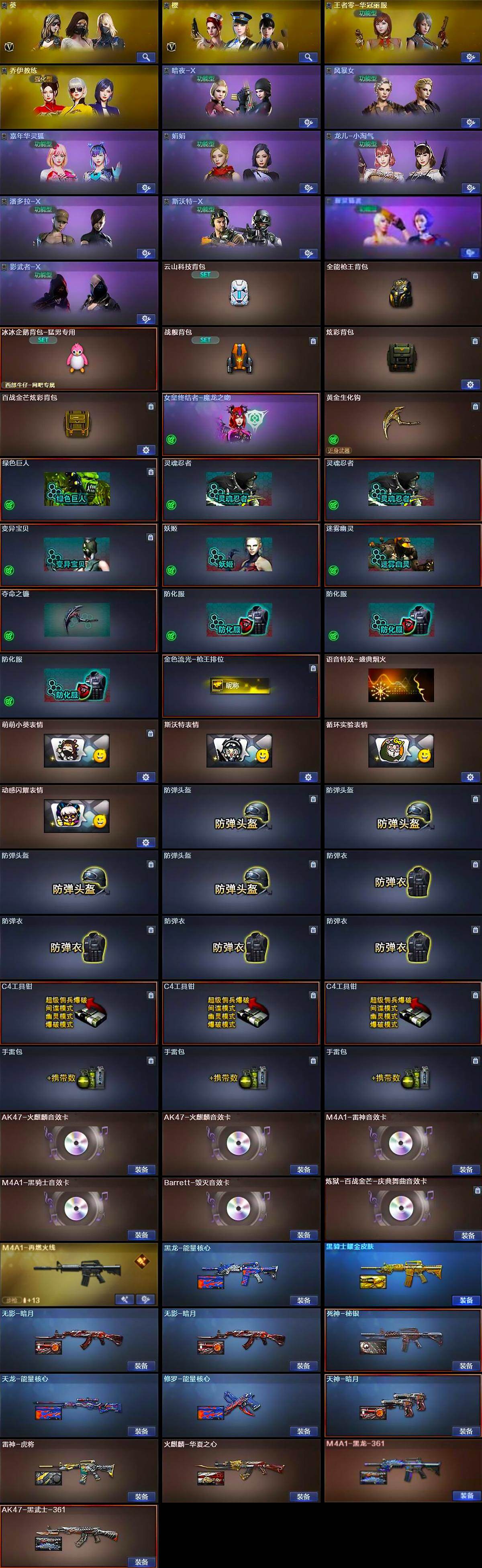 【音效卡】:AK47-火麒麟音效卡*2,M4A1-雷神音效卡,M4A1-黑骑士音效卡,Barrett-毁灭音效卡,炼狱-百战金芒-庆典舞曲音效卡