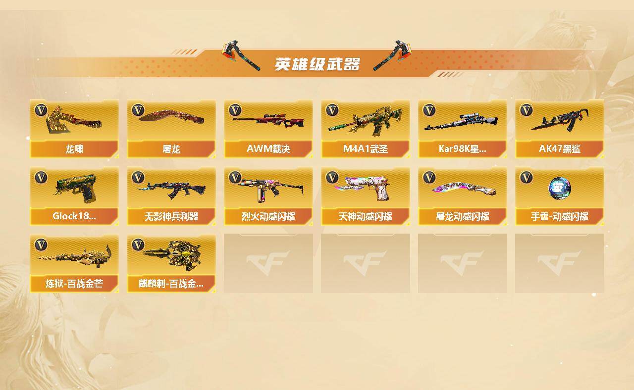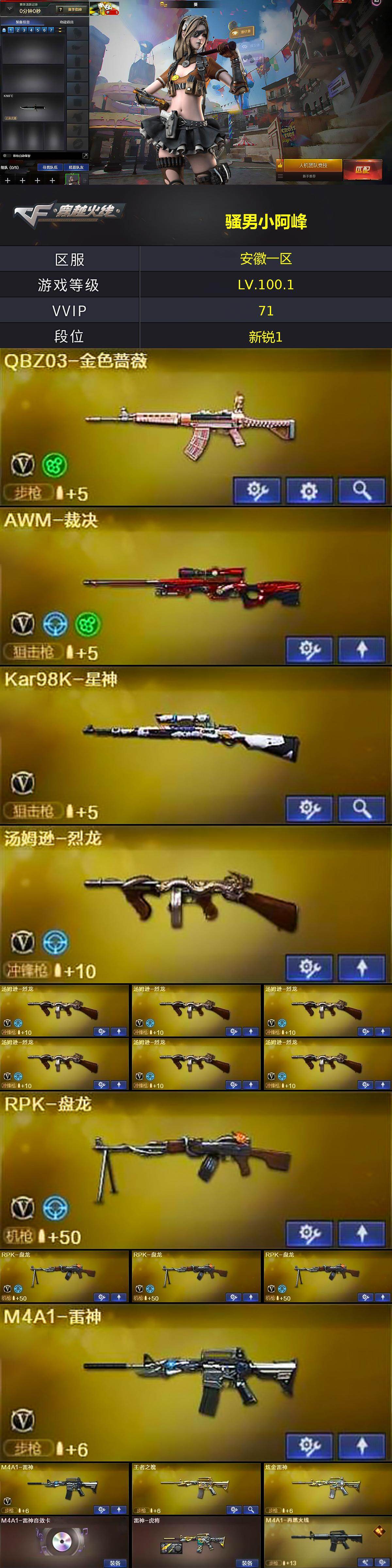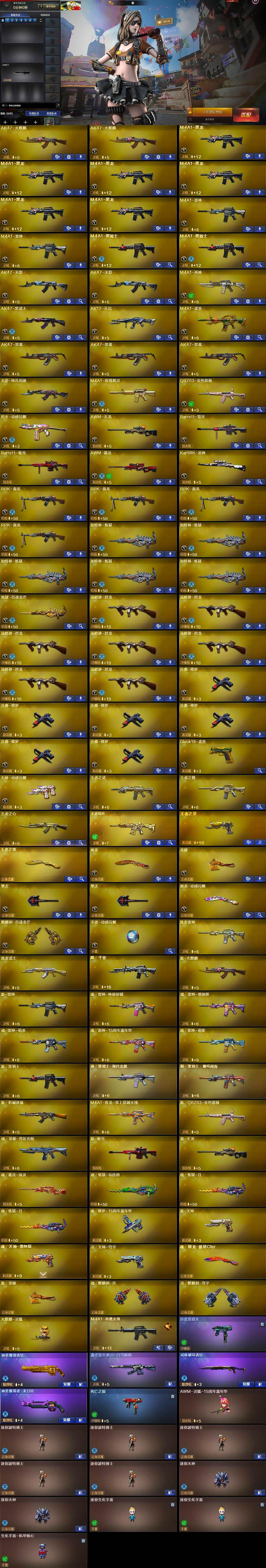 【热门武器】:QBZ03-金色蔷薇,死亡之眼,Kar98K-星神,M4A1-黑骑士*2,汤姆逊-烈龙*7,RPK-盘龙*4,加特林-炼狱*5,沙鹰-修罗*6