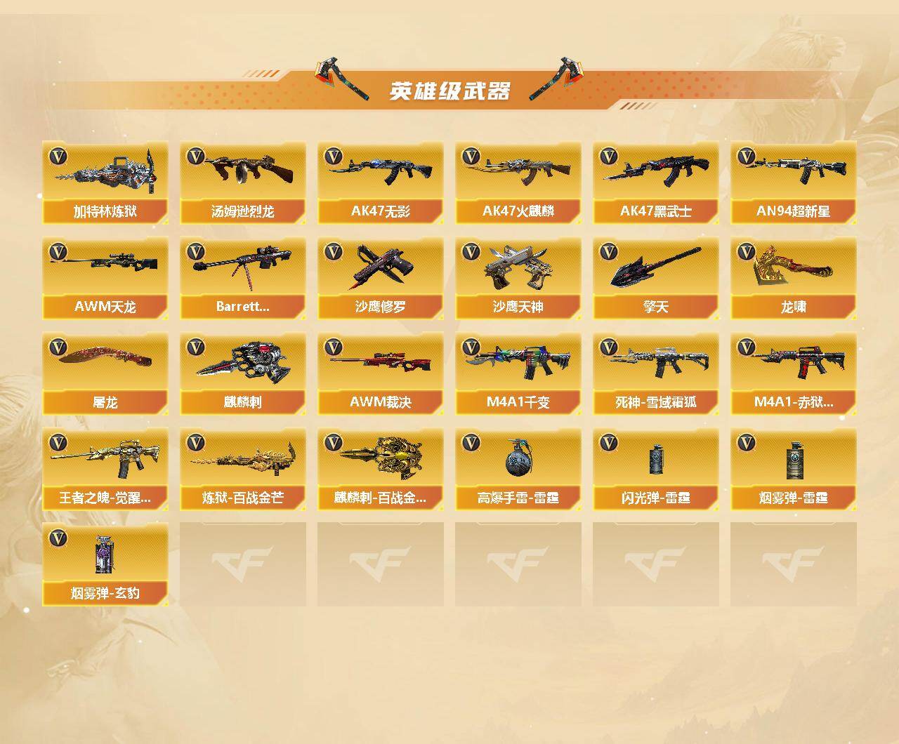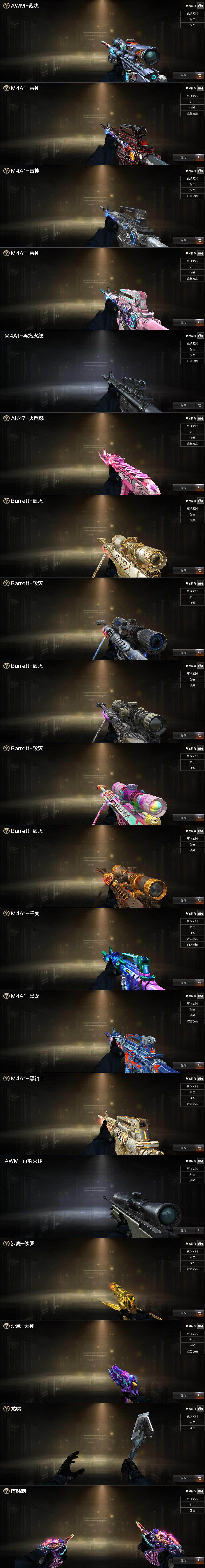 【热门武器】:QBZ03-金色蔷薇,死亡之眼*4,M4A1-黑骑士,汤姆逊-烈龙*7,RPK-盘龙,加特林-炼狱,沙鹰-修罗*6