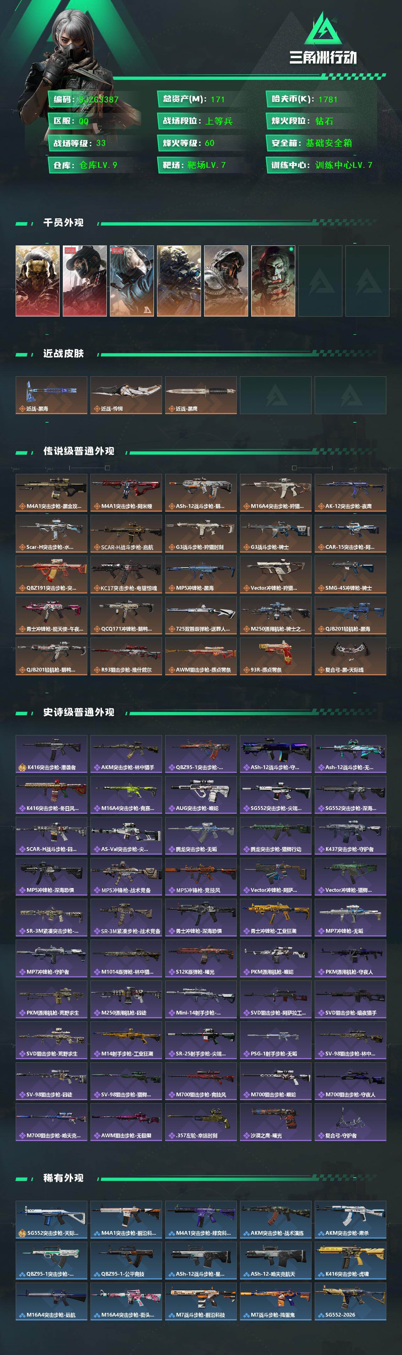 【SJZG3387】总资产(M):171M/哈夫币(K):1781K/哈夫币(K):1781K/传说枪皮数:25/全面战场等级:33_段位:上等兵/烽火地带等级:60_段位:钻石/红狼-蚀金玫瑰/露娜-黑·天际线/蜂医-送葬人·无题密令/无名-夜鹰/深蓝-不破誓约/红狼-电锯惊魂/近战-黑海/近战-怜悯/近战-黑鹰/M4A1突击步枪-蚀金玫瑰/M4A1突击步枪-阿米娅/ASh-12战斗步枪-鹅鸭杀/M16A4突击步枪-狩猎时刻/AK-12突击步枪-夜鹰/SCAR-H战斗步枪-水墨云图/SCAR-