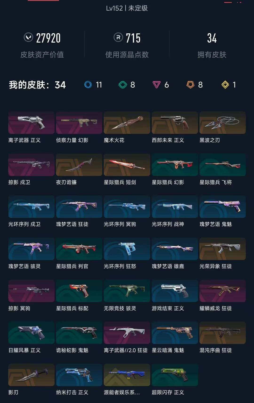 终极*8/传奇*1/卓越*6/皮肤*34/等级*152/段位:未定级