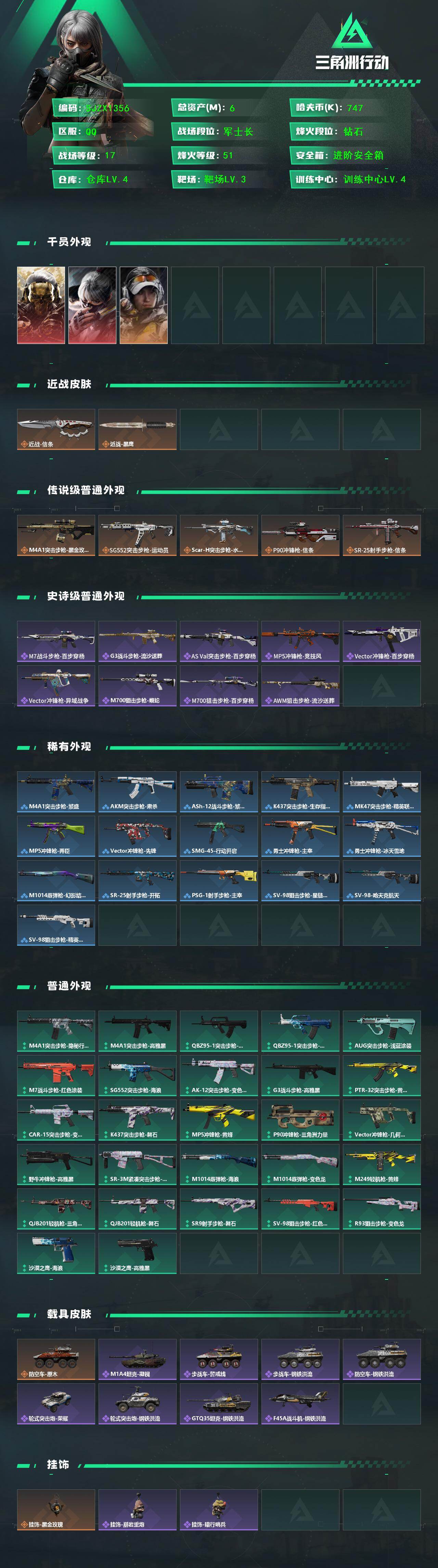 【SJZX1356】总资产(M):6M/哈夫币(K):747K/哈夫币(K):747K/传说枪皮数:5/全面战场等级:17_段位:军士长/烽火地带等级:51_段位:钻石/红狼-蚀金玫瑰/骇爪-水墨云图/露娜-金牌射手/近战-信条/近战-黑鹰/M4A1突击步枪-蚀金玫瑰/SG552突击步枪-运动员/SCAR-H战斗步枪-水墨云图/P90冲锋枪-信条/SR-25射手步枪-信条/M7战斗步枪-百步穿杨/G3战斗步枪-流沙送葬/AS Val突击步枪-百步穿杨/MP5冲锋枪-竞技风/Vector冲锋枪-百