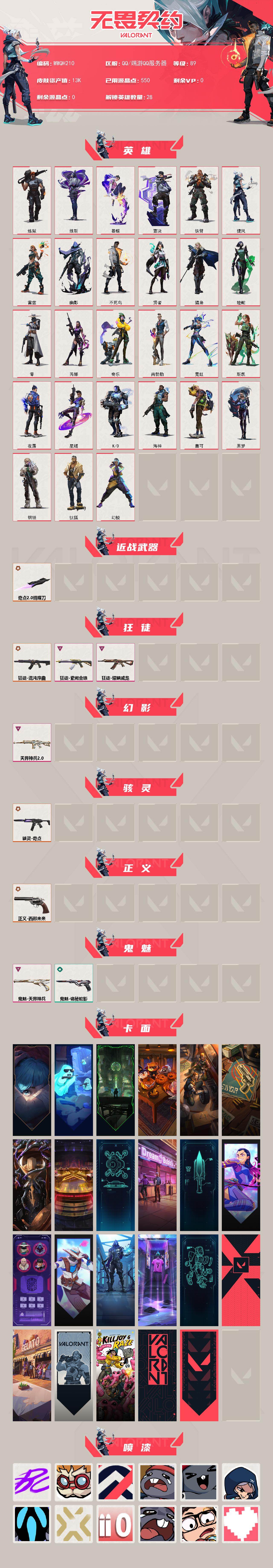 【WWQH210】终极*4/卓越*4/皮肤*11/等级*89/段位:黑铁/幻棱/炼狱/维斯/暮蝶/钛狐/壹决/铁臂/捷风/雷兹/幽影/不死鸟/贤者/猎枭/蝰蛇/零/芮娜/奇乐/尚勃勒/霓虹/斯凯/夜露/星礈/K/O/海神/盖可/黑梦/钢锁/近战武器-奇点//2.0 蝴蝶刀/狂徒-混沌序曲/狂徒-耀鳞威龙/狂徒-紫阙金琅/幻影-天界神兵//2.0/骇灵-奇点/正义-西部未来/鬼魅-天界神兵/鬼魅-诡秘蛇影/《双城之战》拥抱 卡面/精灵大战 卡面/欢迎来到底城 卡面/南瓜盛典 卡面/修车达人 卡面/