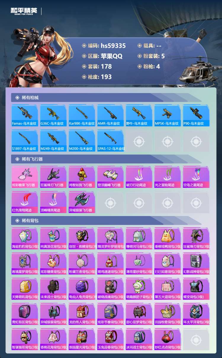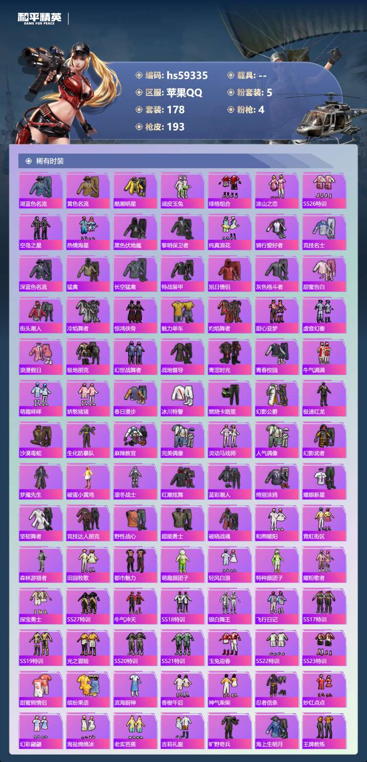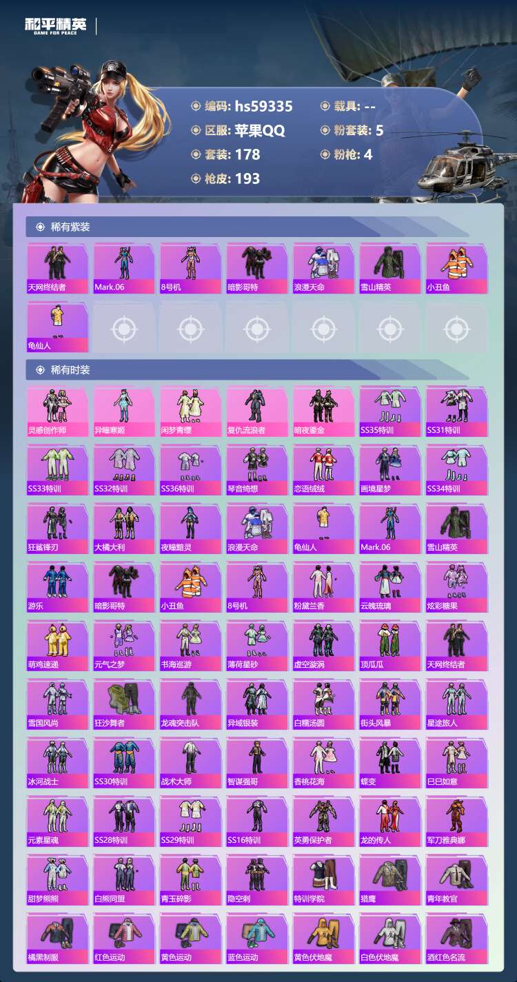 hs59343 安卓手Q-19王牌印记-4粉装-6特效枪-1载具-77527热力值-196套装-27