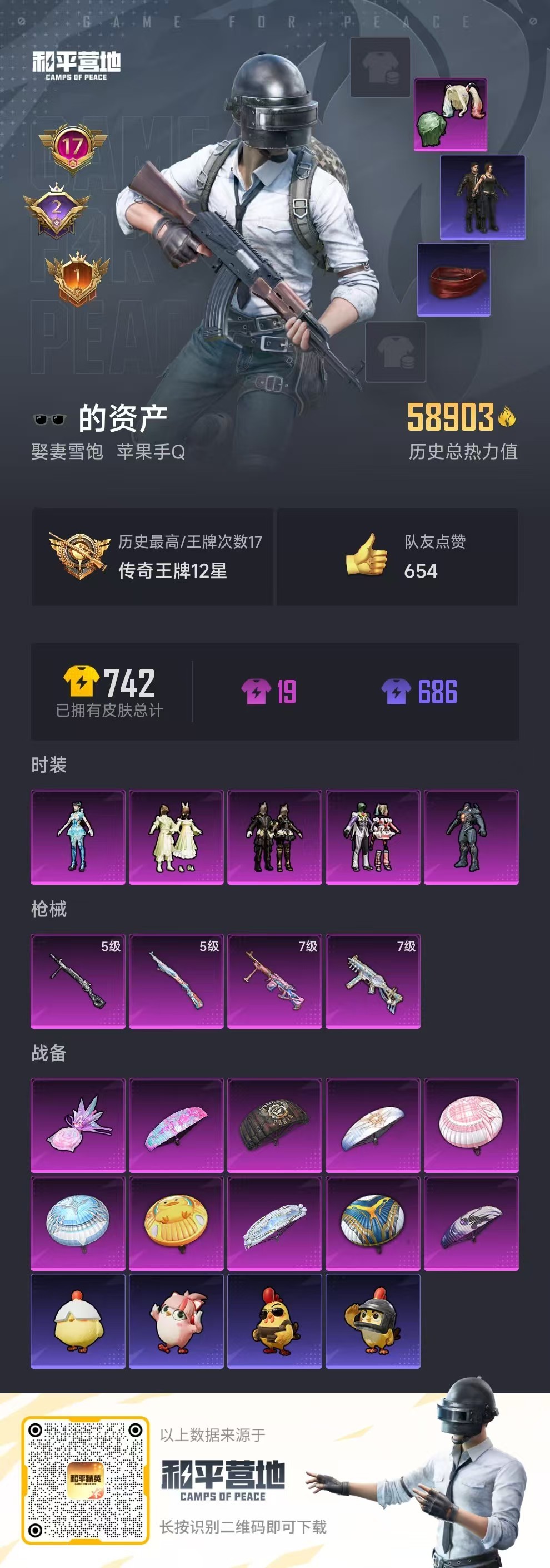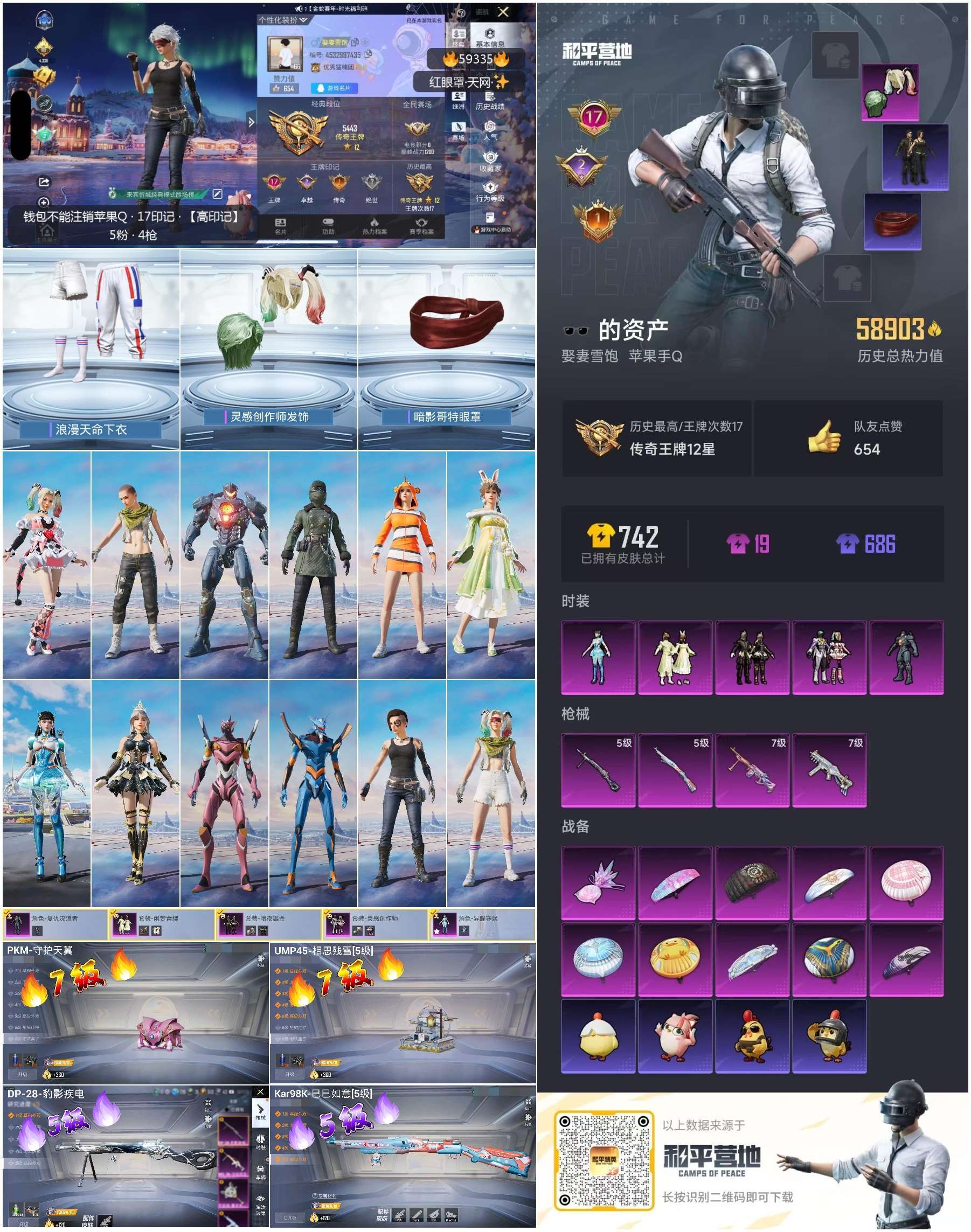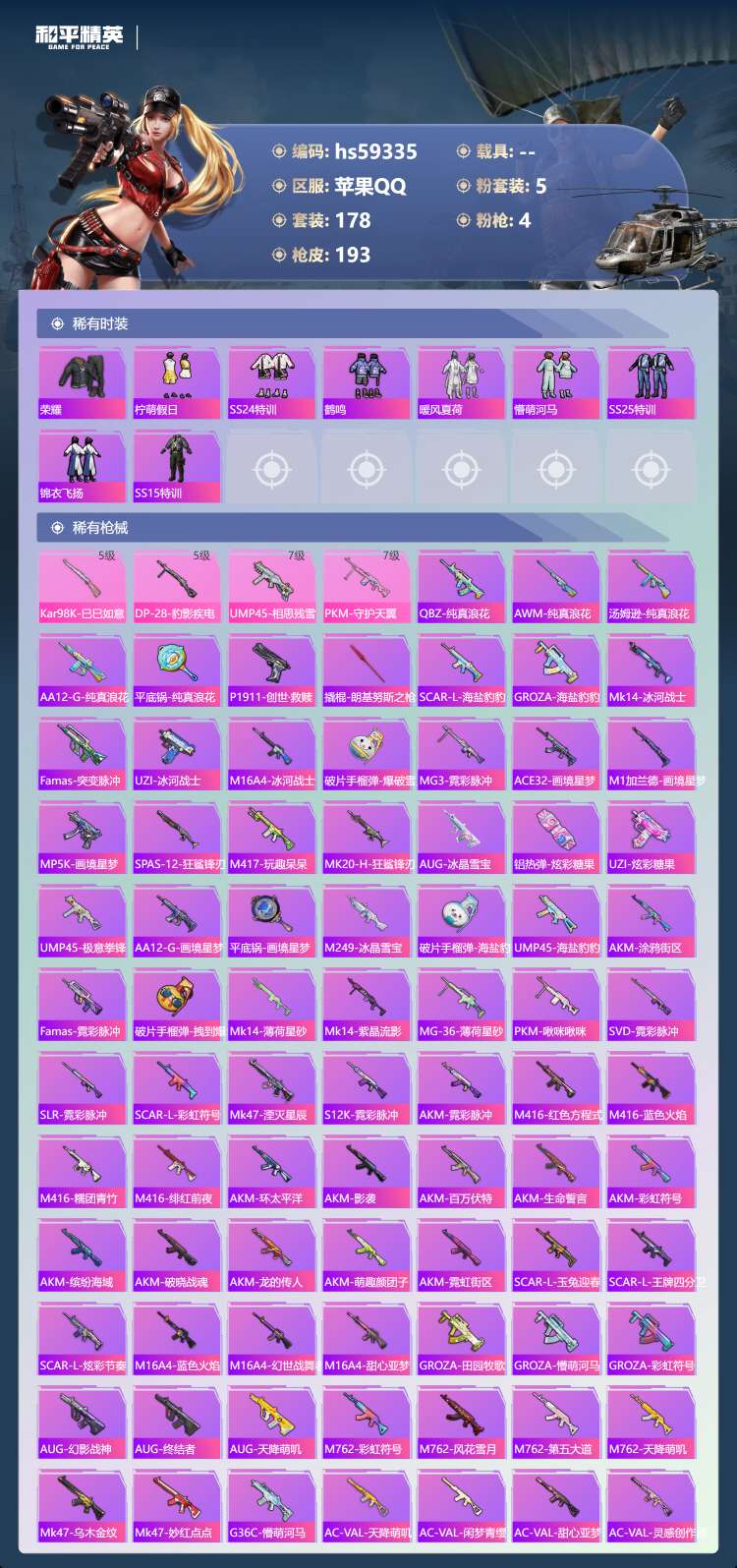 hs59343 安卓手Q-19王牌印记-4粉装-6特效枪-1载具-77527热力值-196套装-27