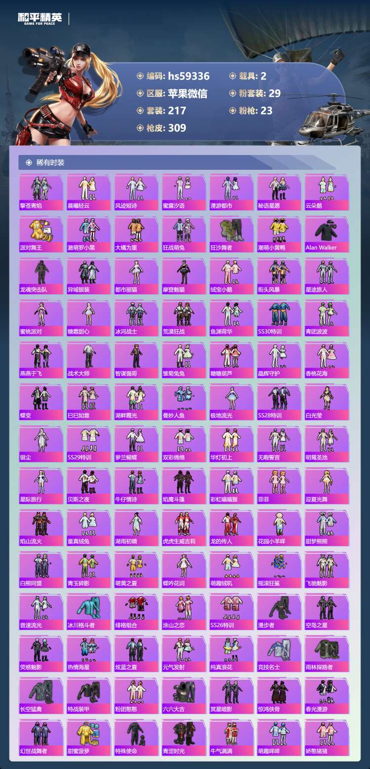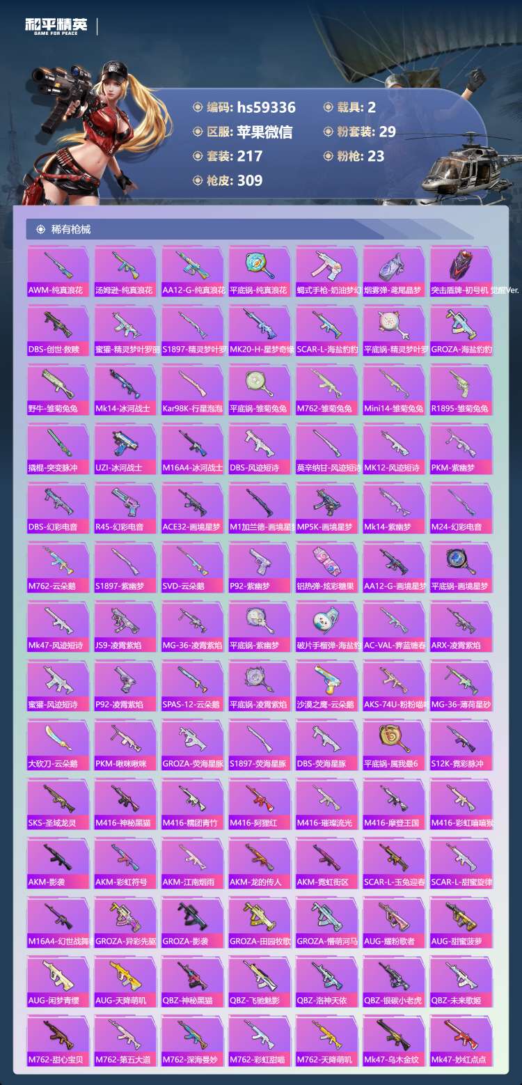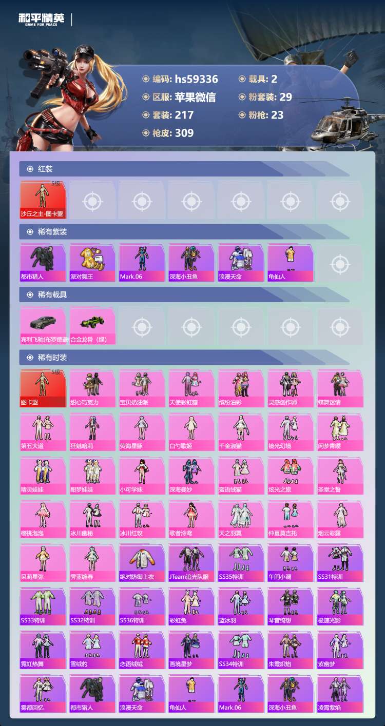 hs59336 苹果微-18王牌印记-有战神框-1红装-29粉装-23特效枪-2载具-119333