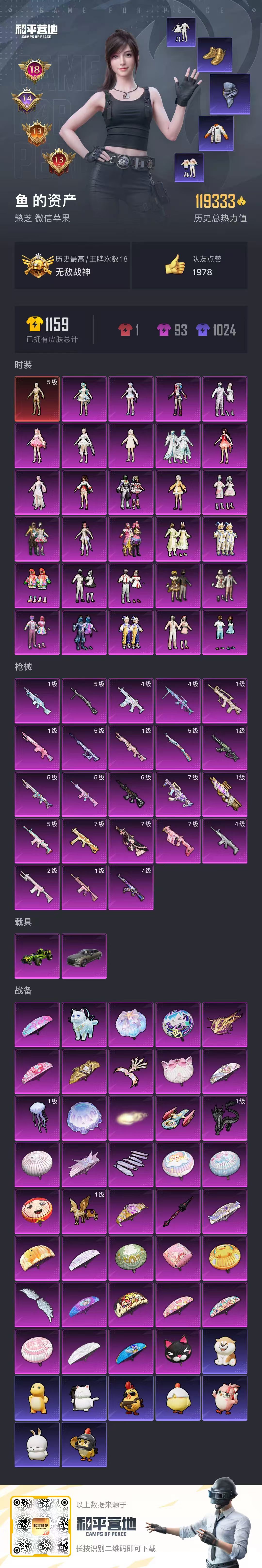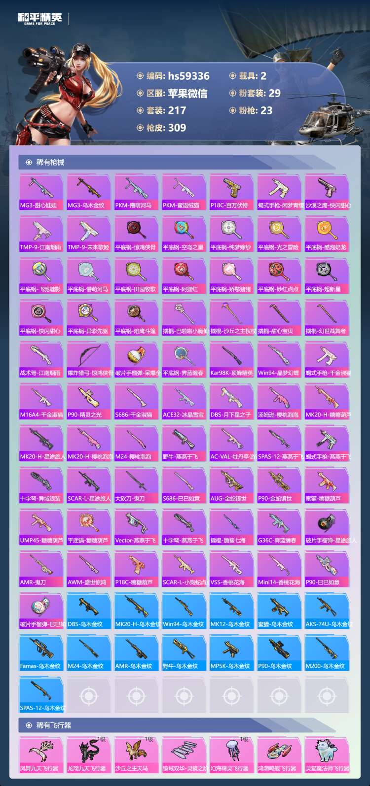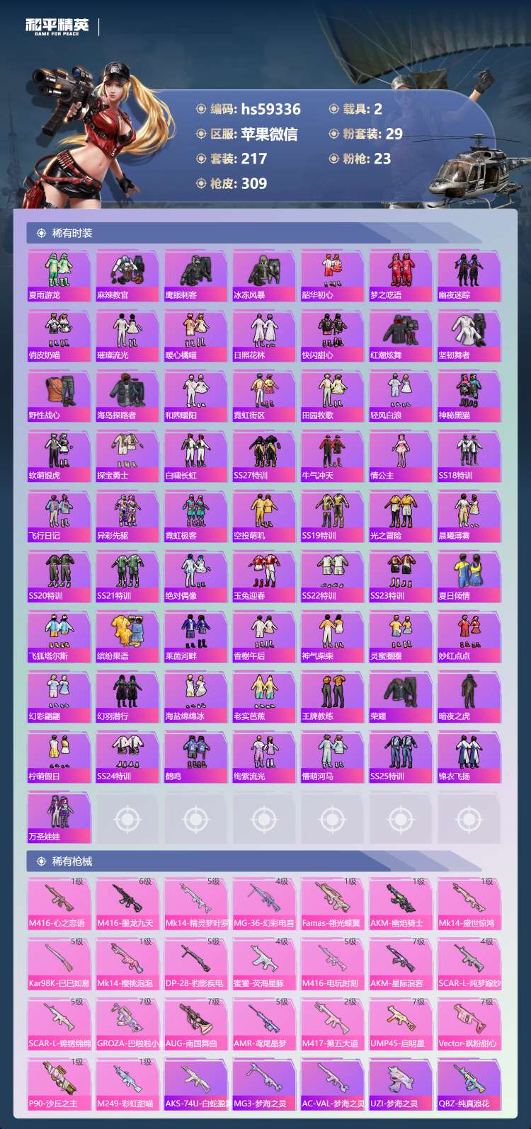 hs59336 苹果微-18王牌印记-有战神框-1红装-29粉装-23特效枪-2载具-119333