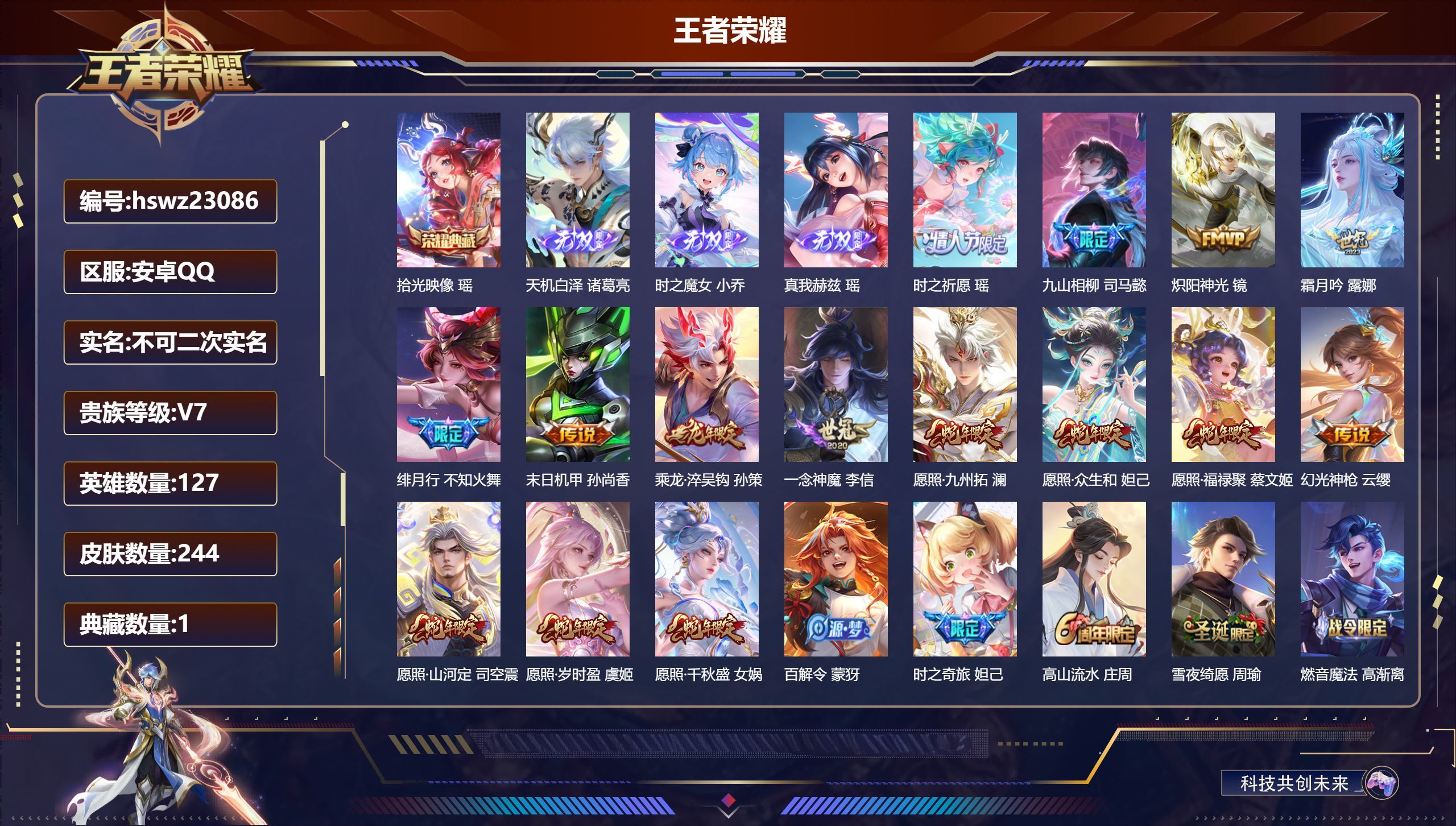 安卓QQ/永恒钻石/244皮肤/127英雄/1典藏/0珍品无双/3无双/0珍品传说/15传说/70史