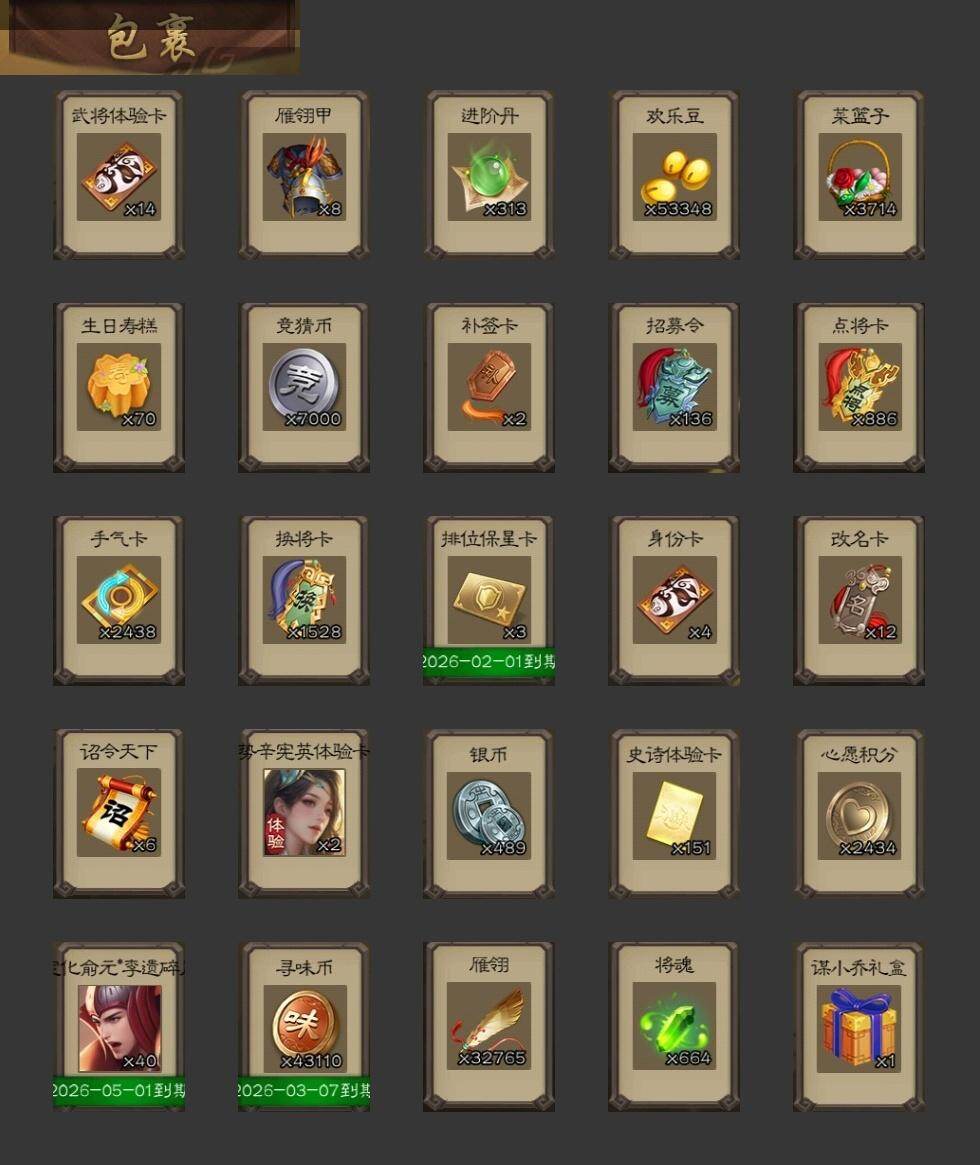 官阶:先锋将军;VIP等级:VIP1;史诗武将数量:2;动态皮肤数量:2;武将总数:72;史诗宝珠数量:0;将魂数量:664;神将:1;魏国史诗武将:2;蜀国史诗武将:0;吴国史诗武将:0;群史诗武将:0