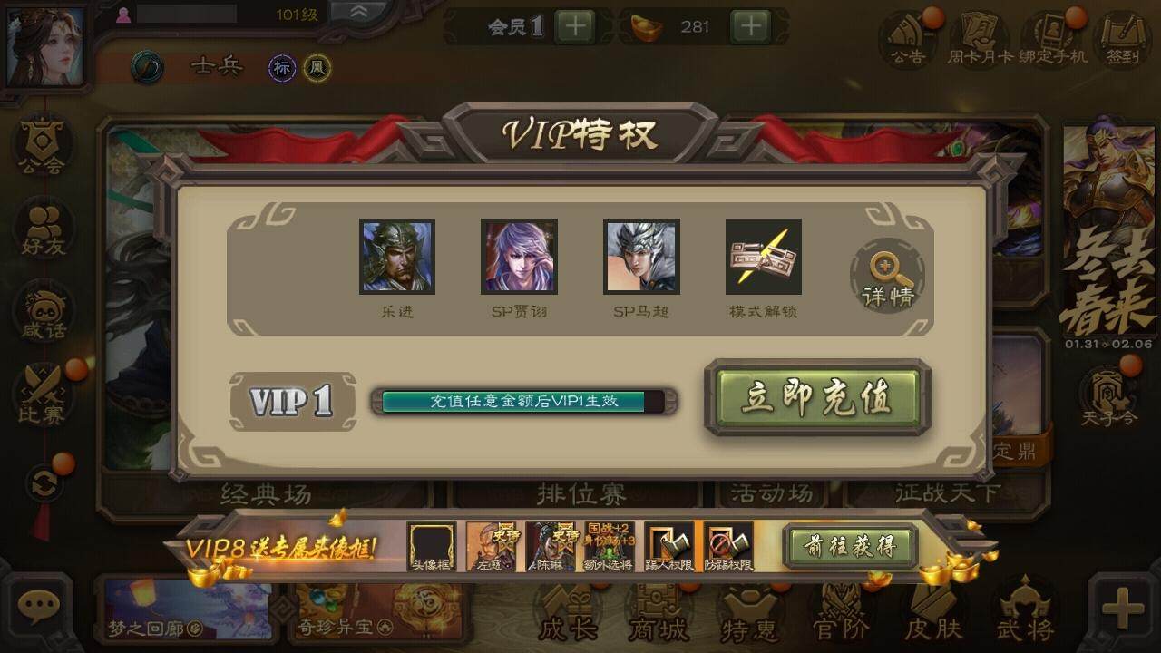 官阶:先锋将军;VIP等级:VIP1;史诗武将数量:2;动态皮肤数量:1;武将