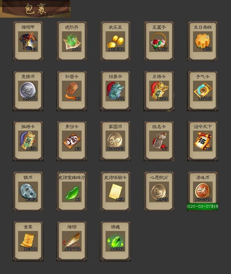 官阶:先锋将军;VIP等级:VIP1;史诗武将数量:2;动态皮肤数量:1;武将总数:69;史诗宝珠数量:0;将魂数量:4992;神将:0;魏国史诗武将:0;蜀国史诗武将:1;吴国史诗武将:1;群史诗武将:0