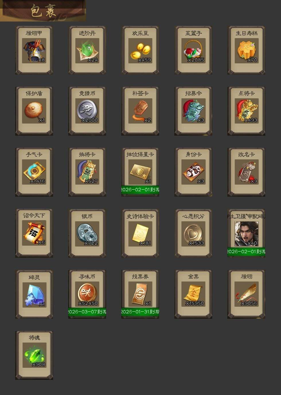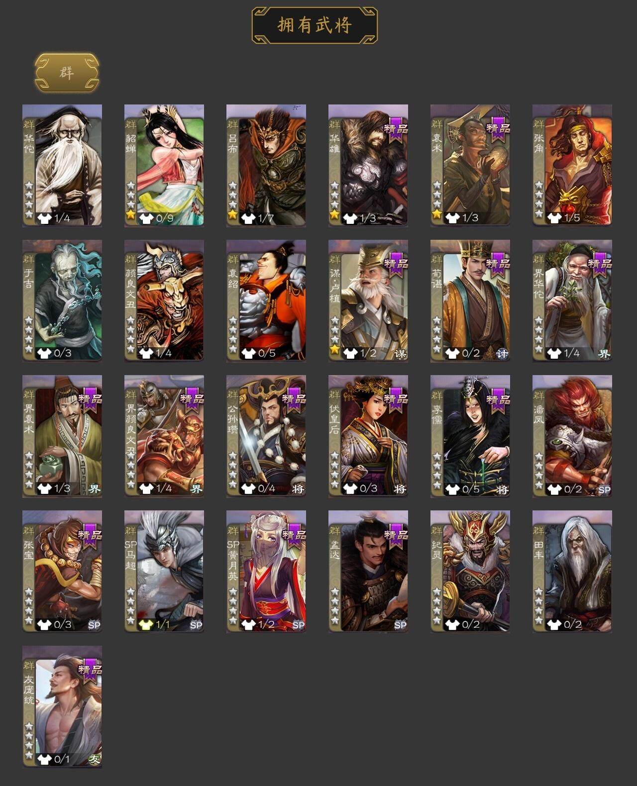 神张辽,关索,势太史慈,乐进,诸葛诞,朱灵,文聘,郭淮,界王异,界曹操,界司马懿,界夏侯惇,曹真,司马伷,臧霸,关银屏,马良,廖化,关平,界关兴张苞,界刘备,界赵云,界马超,吴懿,周仓,糜竺