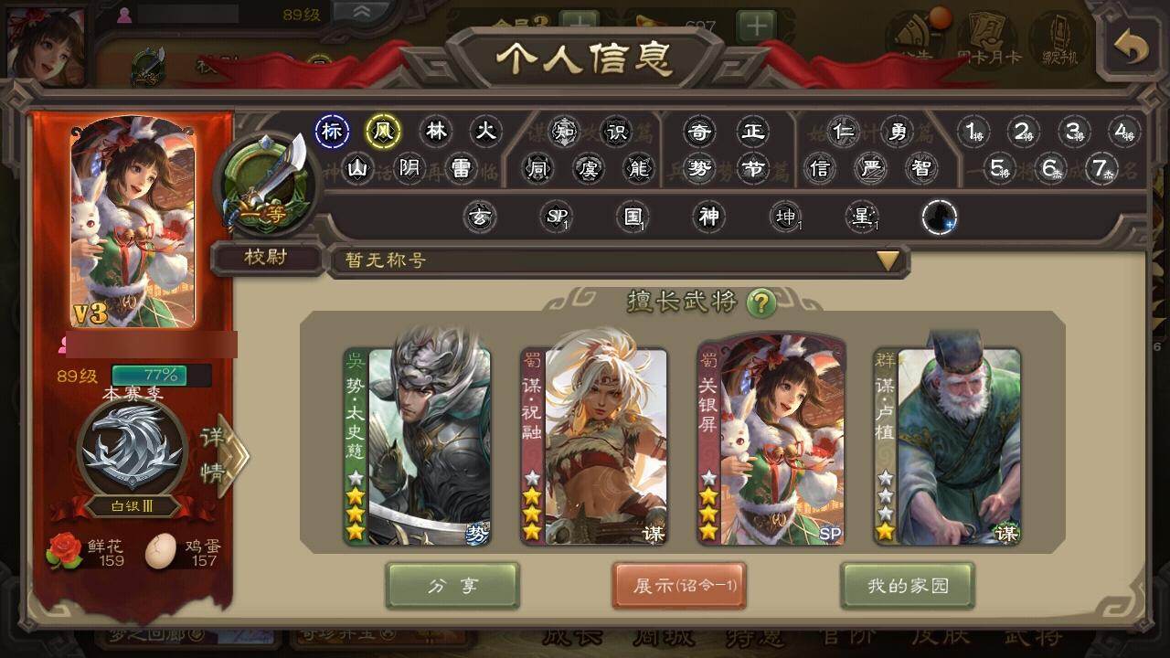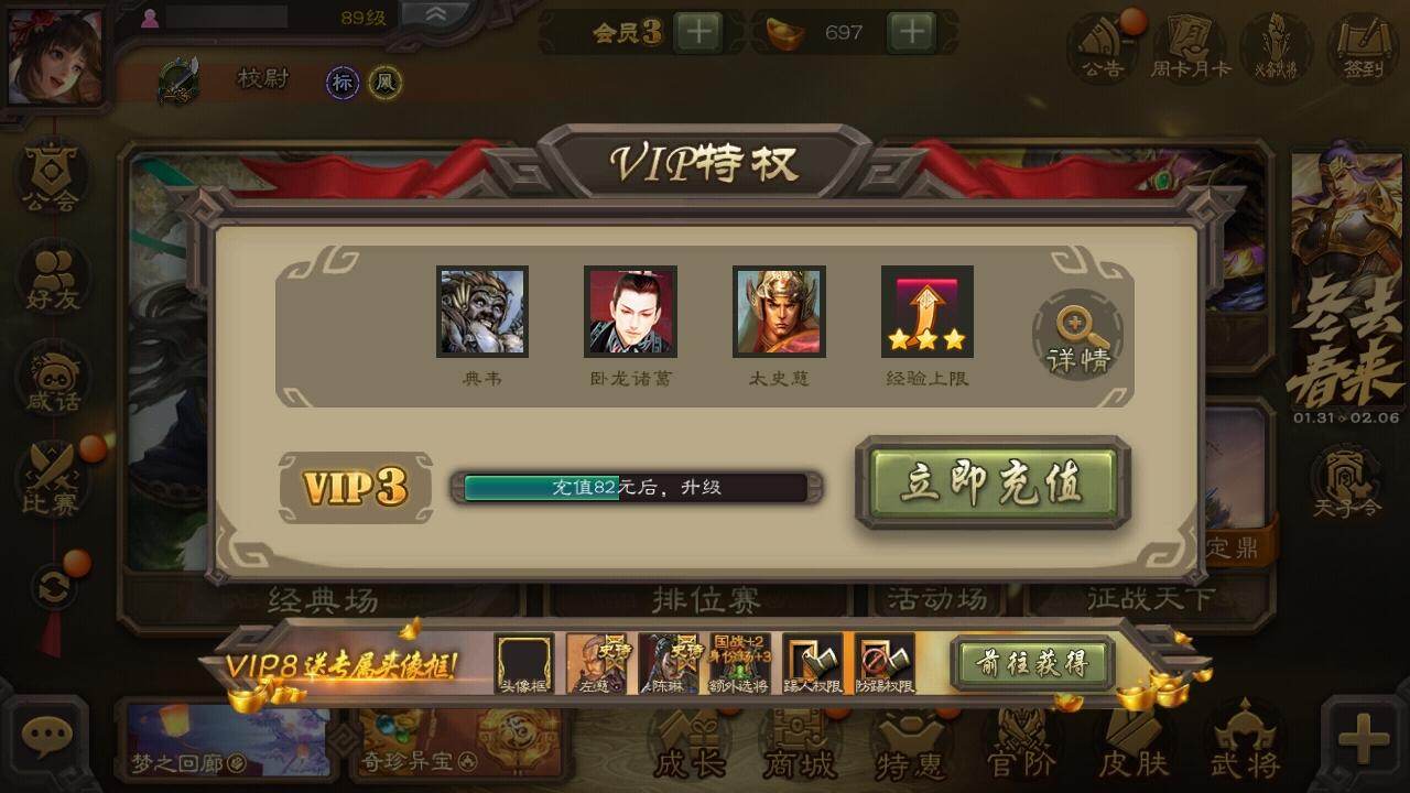 官阶:先锋将军;VIP等级:VIP3;史诗武将数量:3;动态皮肤数量:1;武将
