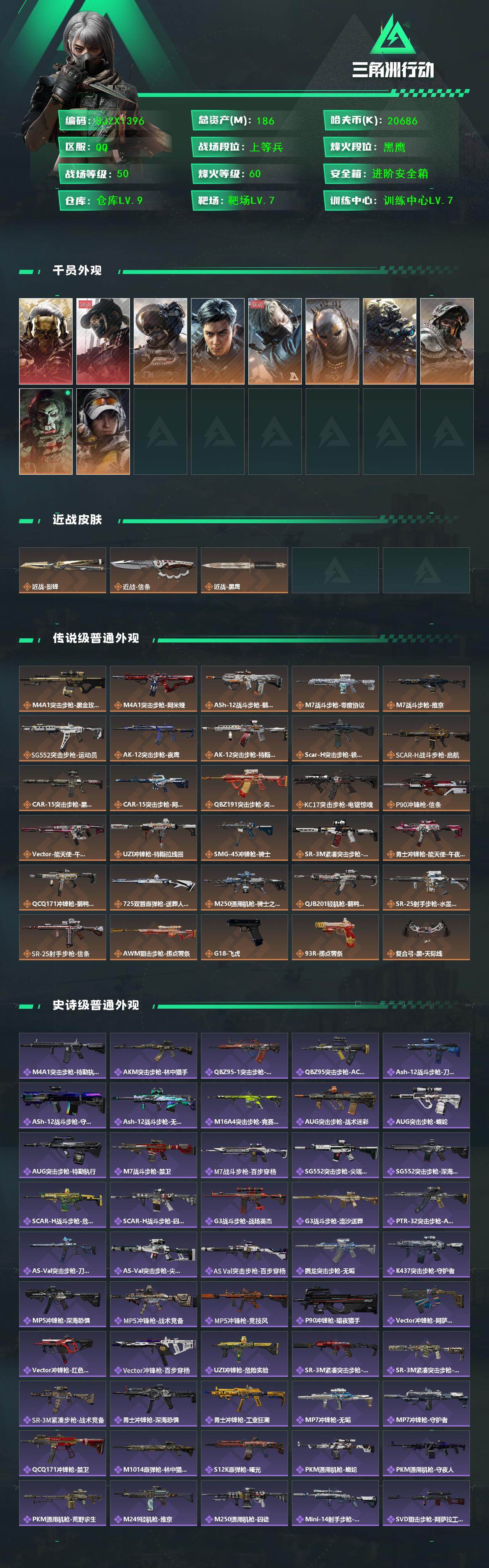 【SJZX1396】总资产(M):186M/哈夫币(K):20686K/哈夫币(K):20686K/传说枪皮数:30/全面战场等级:50_段位:上等兵/烽火地带等级:60_段位:黑鹰/红狼-蚀金玫瑰/露娜-黑·天际线/威龙-壮志凌云/威龙-飞虎/蜂医-送葬人·无题密令/牧羊人-街头之王/无名-夜鹰/深蓝-不破誓约/红狼-电锯惊魂/露娜-金牌射手/近战-影锋/近战-信条/近战-黑鹰/M4A1突击步枪-蚀金玫瑰/M4A1突击步枪-阿米娅/ASh-12战斗步枪-鹅鸭杀/M7战斗步枪-零度协议/M7战斗