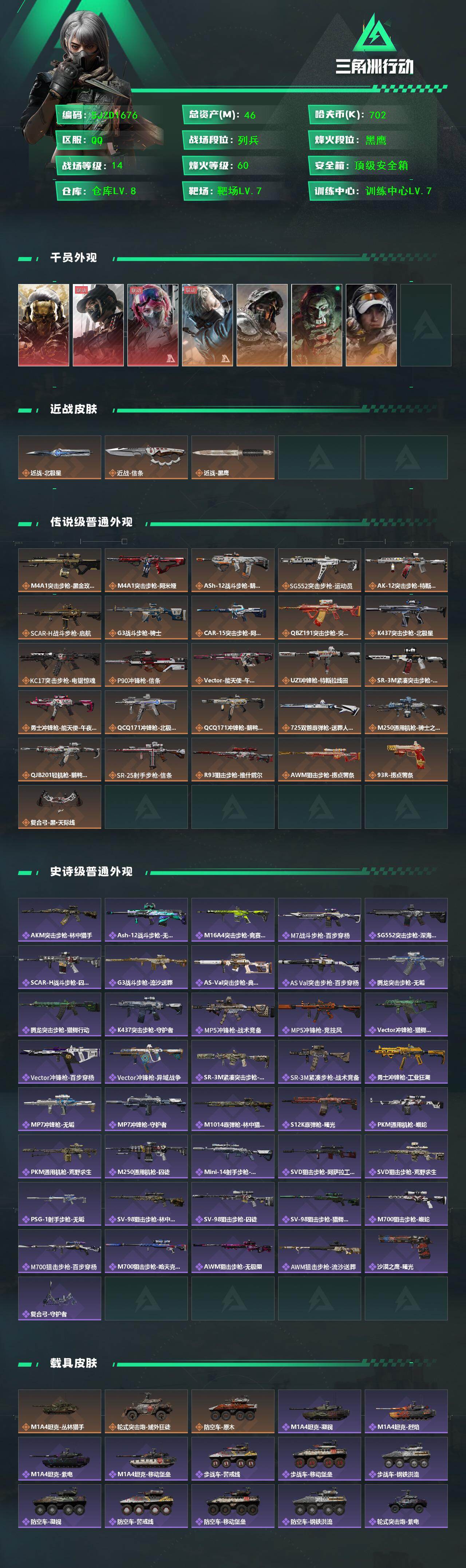 【SJZD1676】总资产(M):46M/哈夫币(K):702K/哈夫币(K):702K/传说枪皮数:26/全面战场等级:14_段位:列兵/烽火地带等级:60_段位:黑鹰/红狼-蚀金玫瑰/露娜-黑·天际线/蛊-能天使午夜邮差/蜂医-送葬人·无题密令/深蓝-不破誓约/红狼-电锯惊魂/露娜-金牌射手/近战-北极星/近战-信条/近战-黑鹰/M4A1突击步枪-蚀金玫瑰/M4A1突击步枪-阿米娅/ASh-12战斗步枪-鹅鸭杀/SG552突击步枪-运动员/AK-12突击步枪-特斯拉线圈/SCAR-H战斗步枪