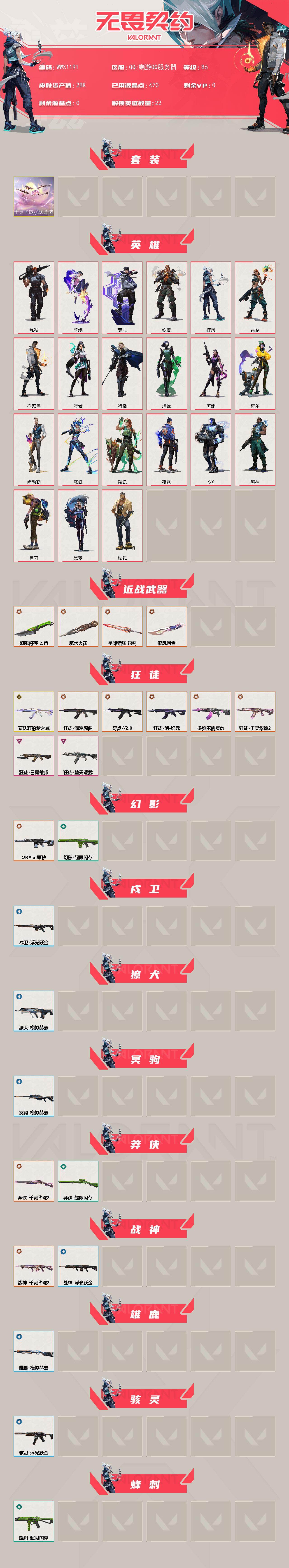 【WWX1191】终极*14/传奇*2/卓越*3/皮肤*54/等级*86/段位:白银/千灵华绽//2.0套装/炼狱/暮蝶/钛狐/壹决/铁臂/捷风/雷兹/不死鸟/贤者/猎枭/蝰蛇/芮娜/奇乐/尚勃勒/霓虹/斯凯/夜露/K/O/海神/盖可/黑梦/近战武器-流风回雪/近战武器-魔术火花/近战武器-超限闪存 匕首/近战武器-星际猎兵 短剑/狂徒-艾沃莉的梦之翼/狂徒-混沌序曲/狂徒-奇点//2.0/狂徒-创·纪元/狂徒-多弥尔的复仇/狂徒-千灵华绽//2.0/狂徒-堕天遗武/狂徒-日冕雄师/幻影-ORA