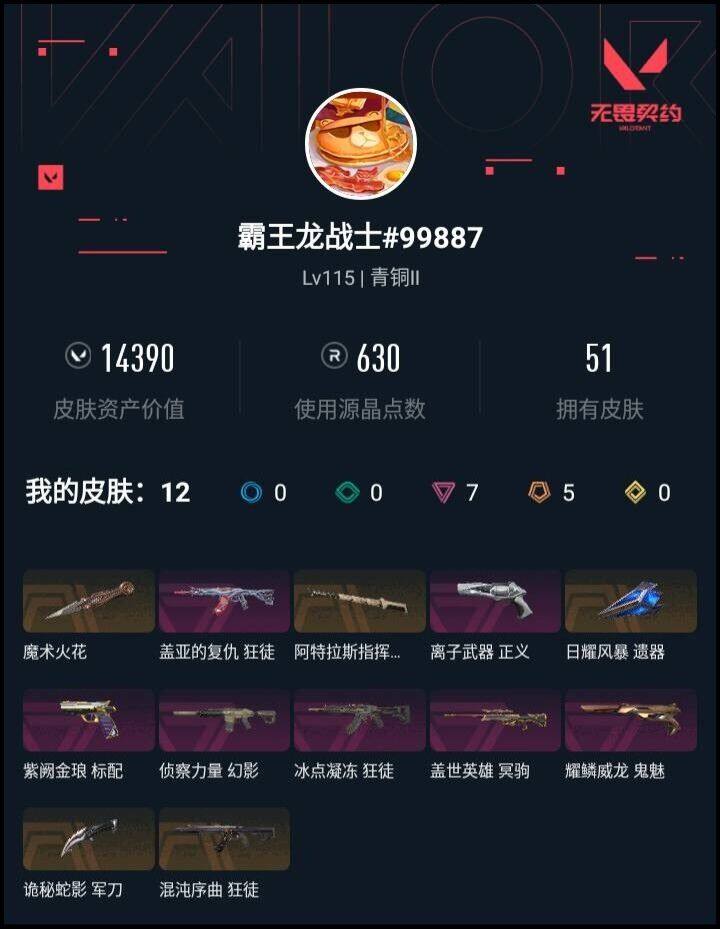 终极*5/卓越*7/皮肤*51/等级*115/段位:青铜/幻棱/炼狱