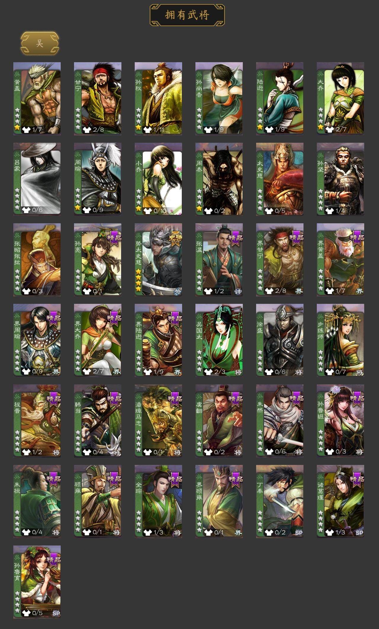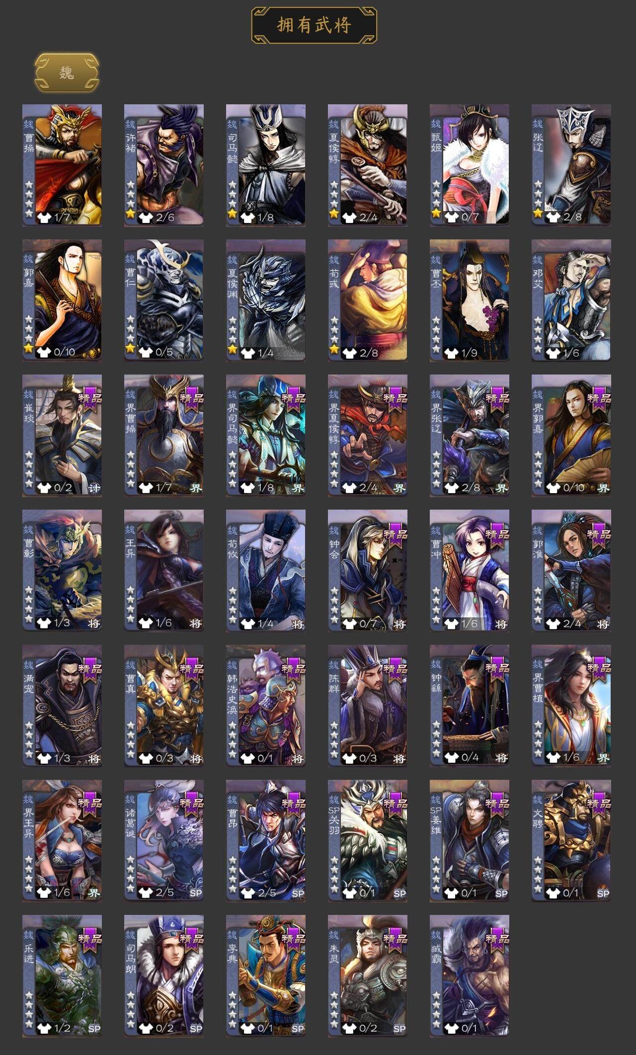 势太史慈,左慈,SP关羽,乐进,曹昂,诸葛诞,朱灵,文聘,SP姜维,钟会,曹冲,郭淮,满宠,界王异,界曹操,界司马懿,界夏侯惇,界张辽,界郭嘉,李典,曹真,韩浩史涣,陈群,钟繇,司马朗,界曹植,