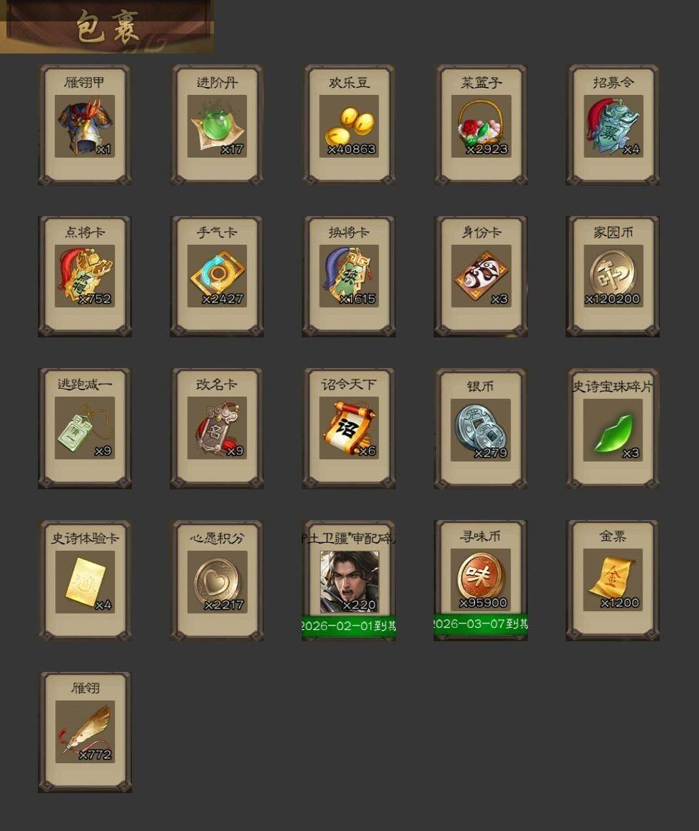 官阶:先锋将军;VIP等级:VIP1;史诗武将数量:2;动态皮肤数量:3;武将总数:141;史诗宝珠数量:0;将魂数量:0;神将:0;魏国史诗武将:4;蜀国史诗武将:0;吴国史诗武将:1;群史诗武将:1