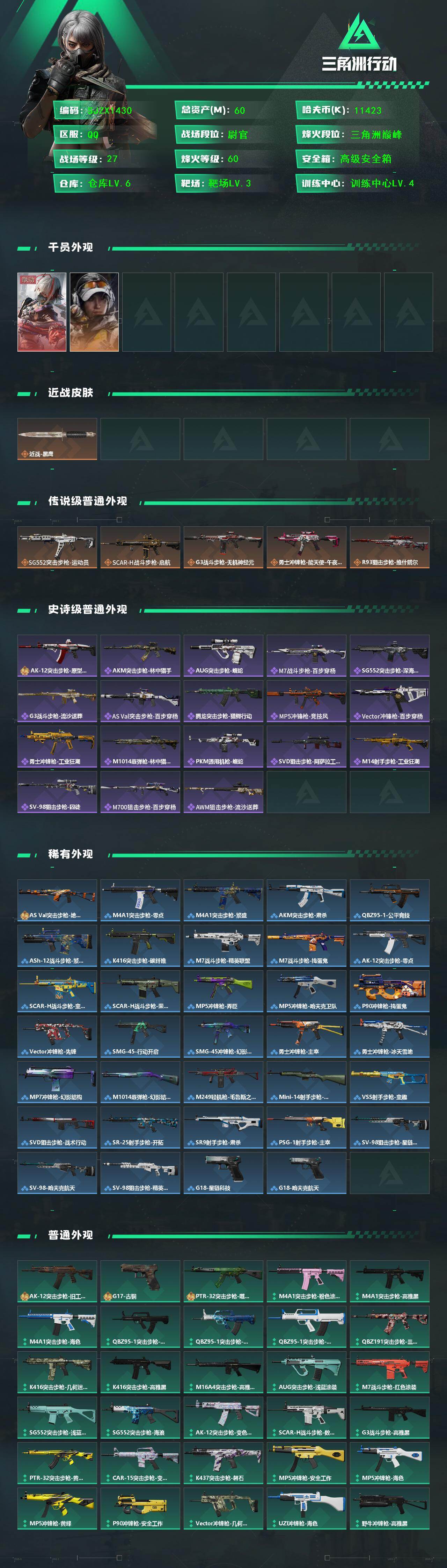 【SJZX1430】总资产(M):60M/哈夫币(K):11423K/哈夫币(K):11423K/传说枪皮数:5/全面战场等级:27_段位:尉官/烽火地带等级:60_段位:三角洲巅峰/骇爪-维什戴尔/露娜-金牌射手/近战-黑鹰/SG552突击步枪-运动员/SCAR-H战斗步枪-启航/G3战斗步枪-无机神经元/勇士冲锋枪-能天使-午夜邮差/R93狙击步枪-维什戴尔/AK-12突击步枪-原型机/AKM突击步枪-林中猎手/AUG突击步枪-蝮蛇/M7战斗步枪-百步穿杨/SG552突击步枪-深海恐惧/G3