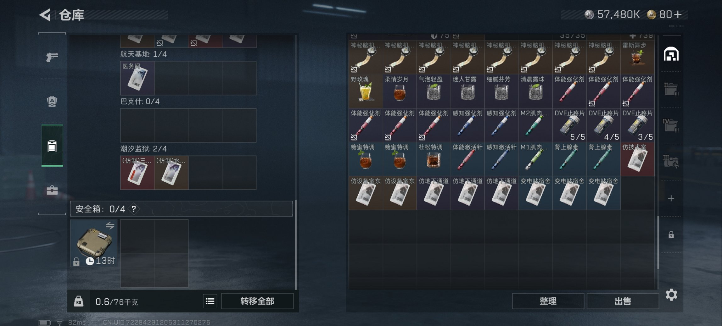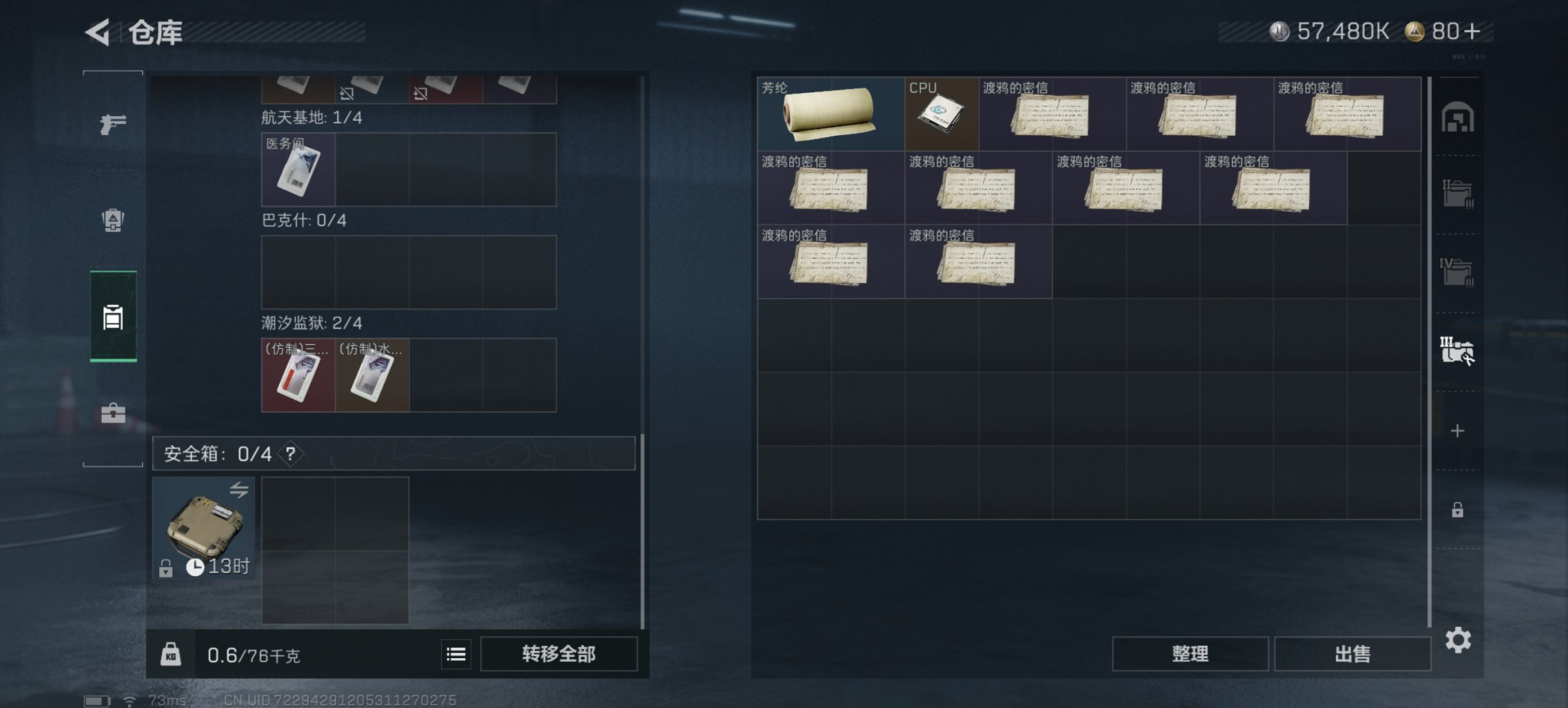 总资产77M【10颗AW子弹】哈夫币57,480K,行动等级:39,仓库等级: