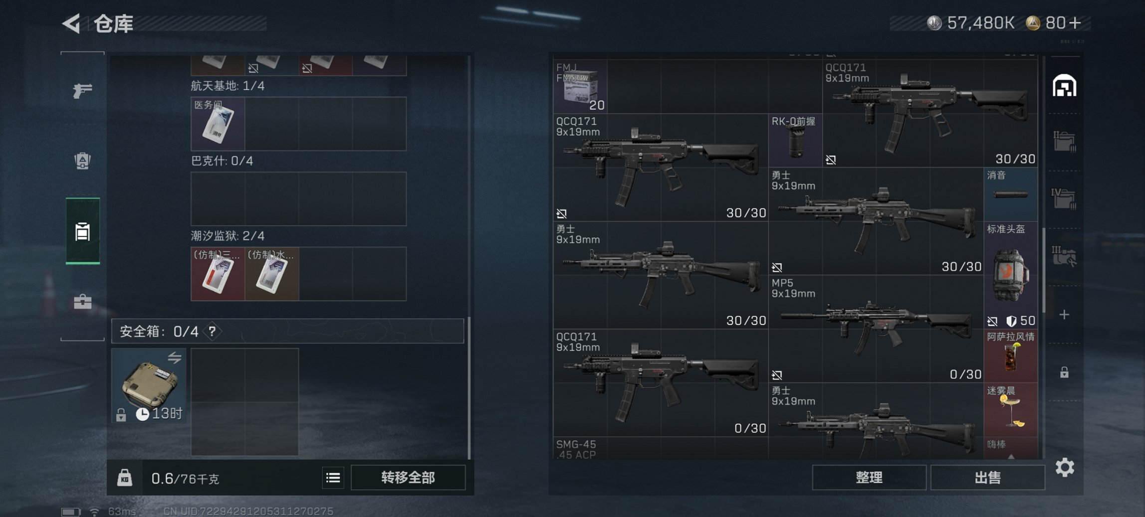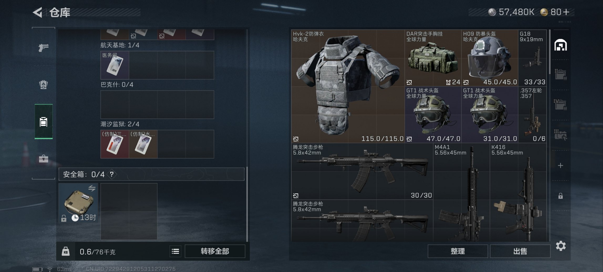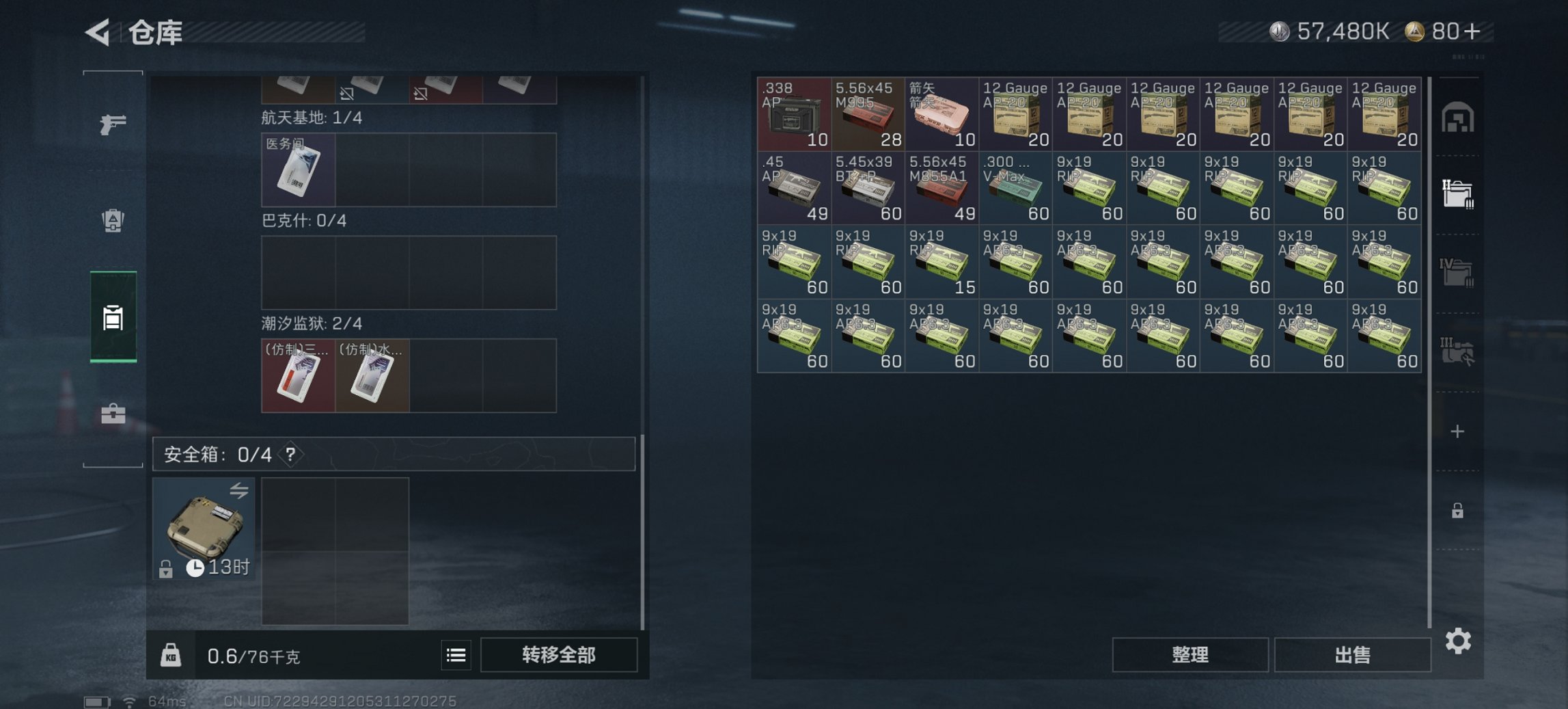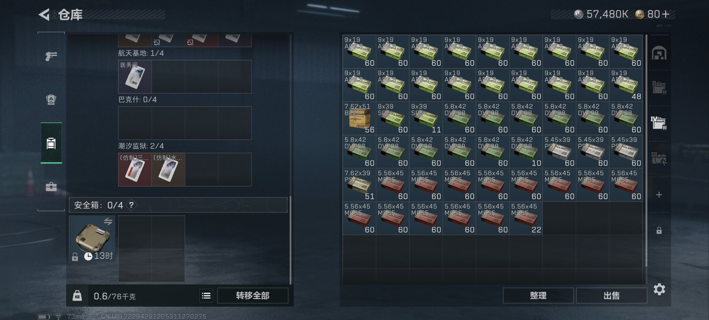 总资产77M【10颗AW子弹】哈夫币57,480K,行动等级:39,仓库等级:5,训练中心等级:4,靶场等级:3,枪皮:20
