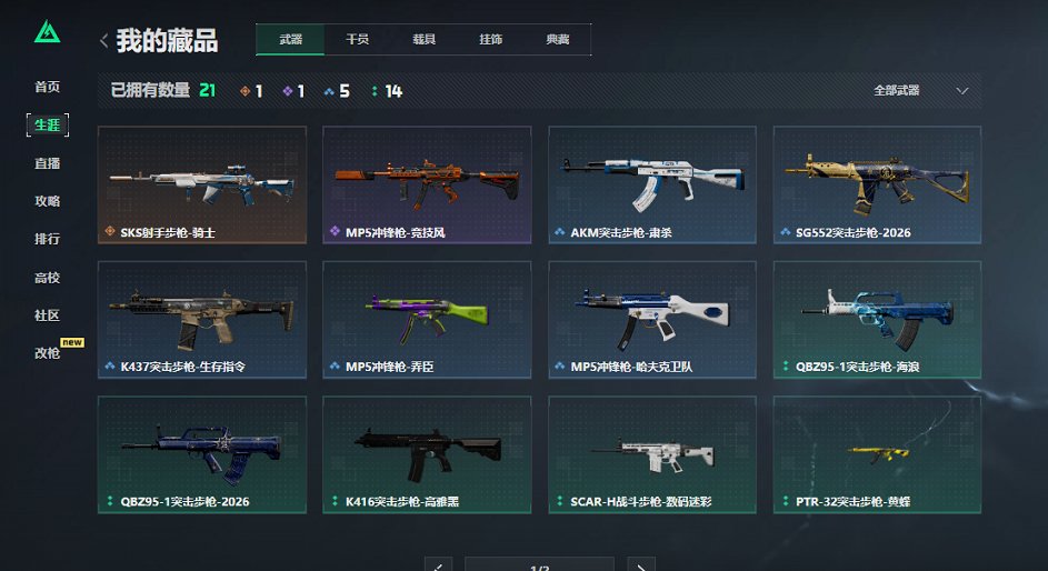 【枪皮】 PTR-32突击步枪-黄蜂 QBZ95-1突击步枪-海浪 SCAR-H战斗步枪-数码迷彩 K416突击步枪-高雅黑 MP5冲锋枪-弄臣 沙漠之鹰-海浪