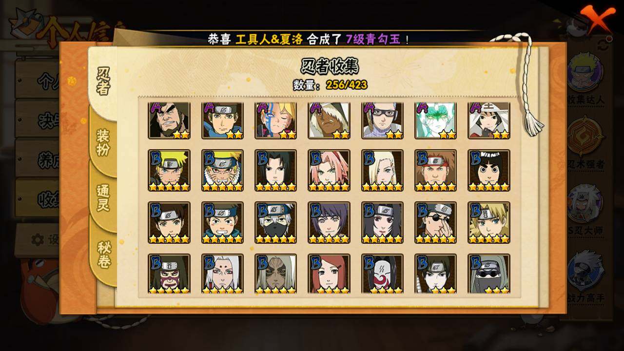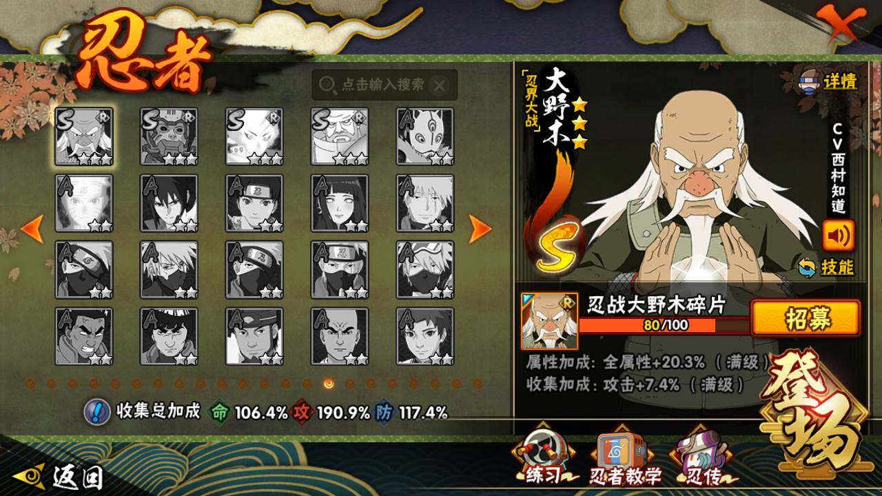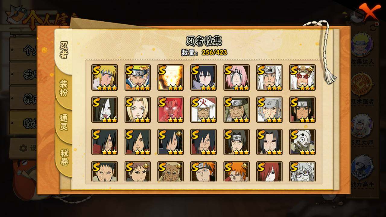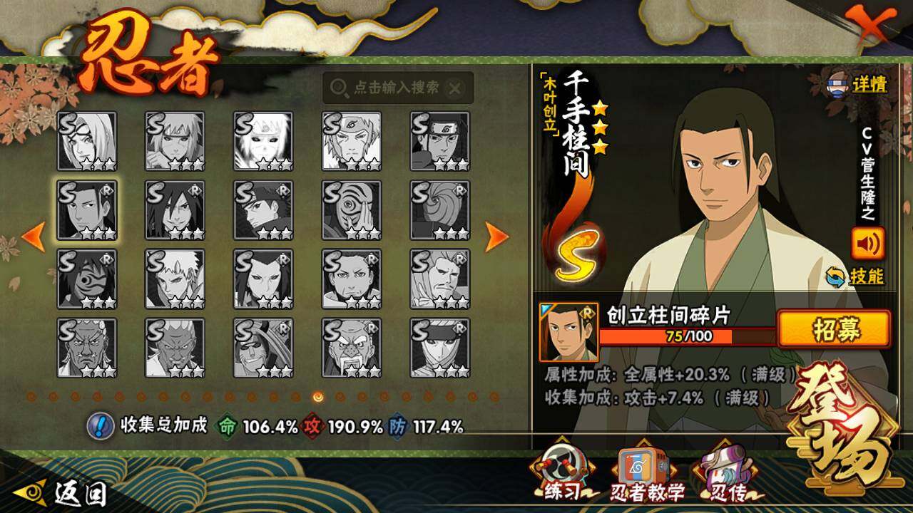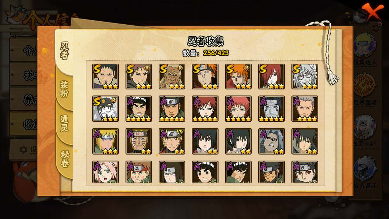 【S级忍者】:长门「秽土转生」(3星),猿飞日斩「秽土转生」(3星),千手扉间「秽土转生」(3星),千手柱间「秽土转生」(3星),宇智波鼬「秽土转生」(3星),宇智波斑「秽土转生」(3星),宇智波斑「秽土转生·解」(3星),春野樱「忍界大战」(3星),宇智波带土「忍界大战」(3