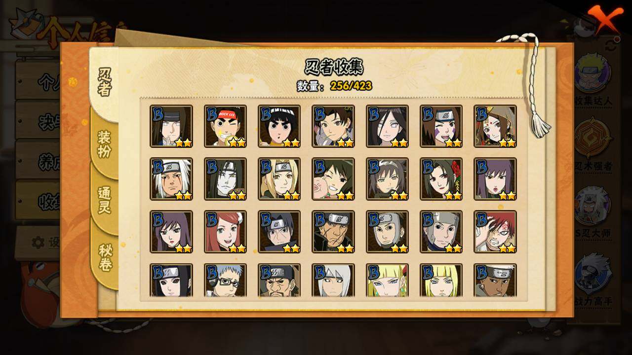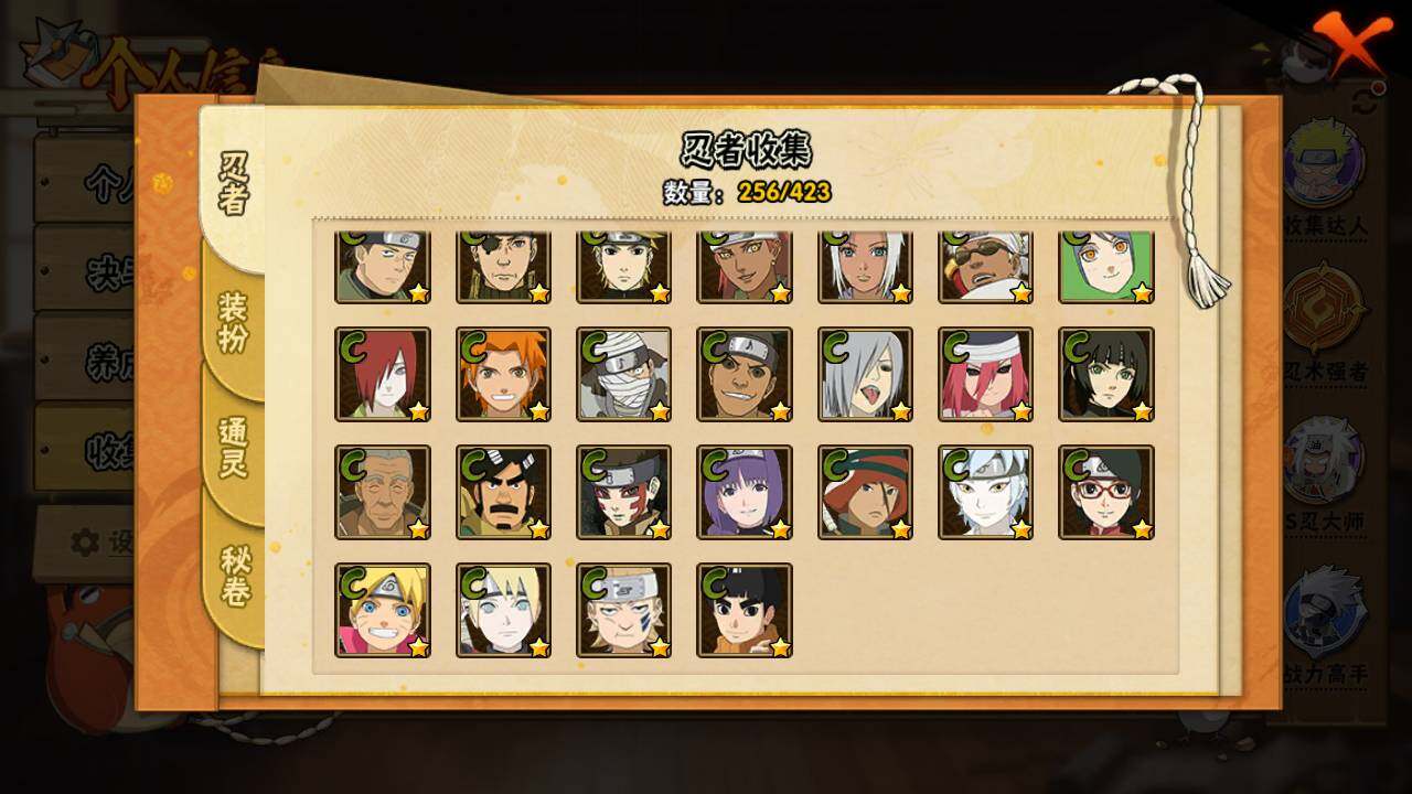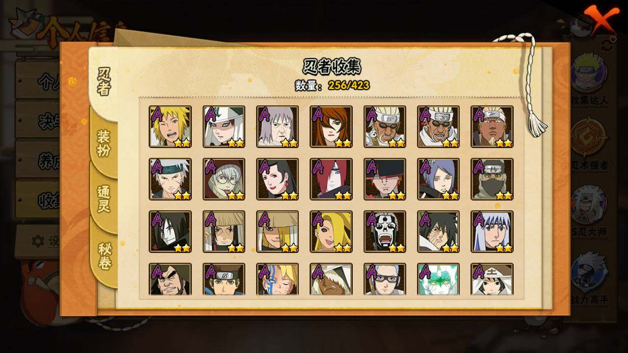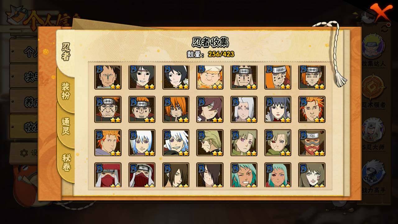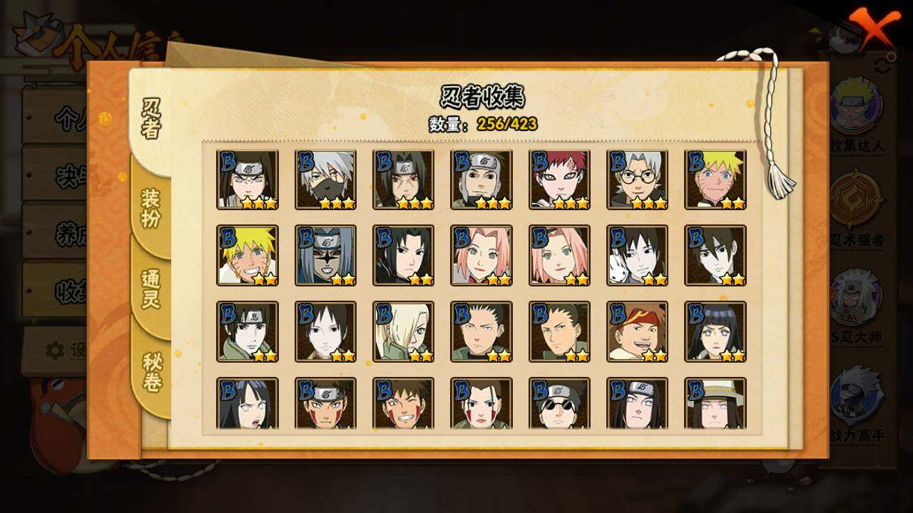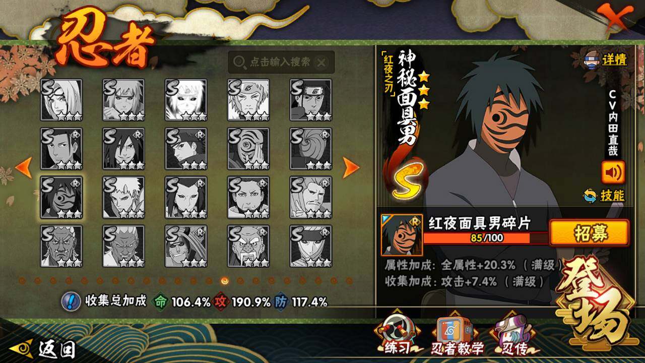 【S级忍者】:长门「秽土转生」(3星),猿飞日斩「秽土转生」(3星),千手扉间「秽土转生」(3星),千手柱间「秽土转生」(3星),宇智波鼬「秽土转生」(3星),宇智波斑「秽土转生」(3星),宇智波斑「秽土转生·解」(3星),春野樱「忍界大战」(3星),宇智波带土「忍界大战」(3