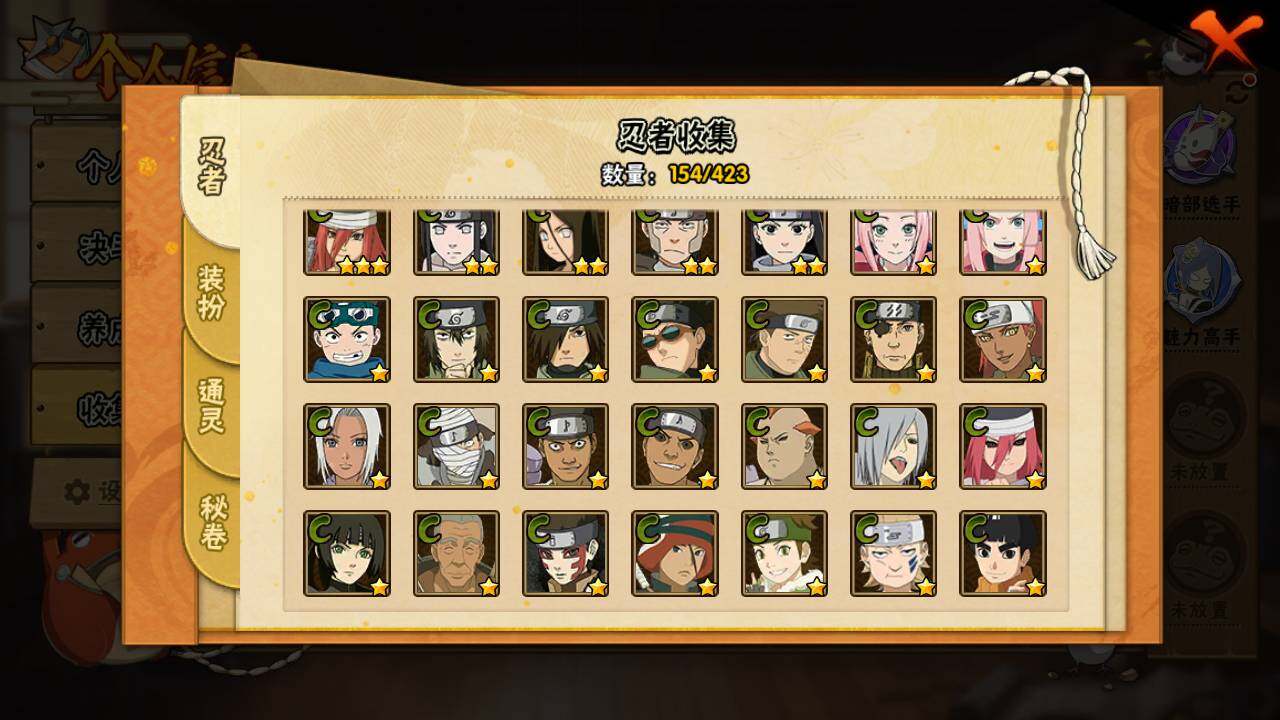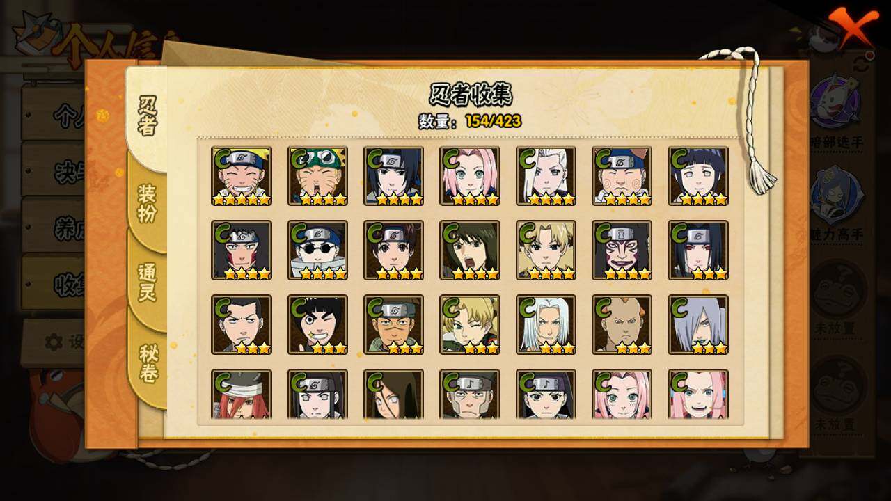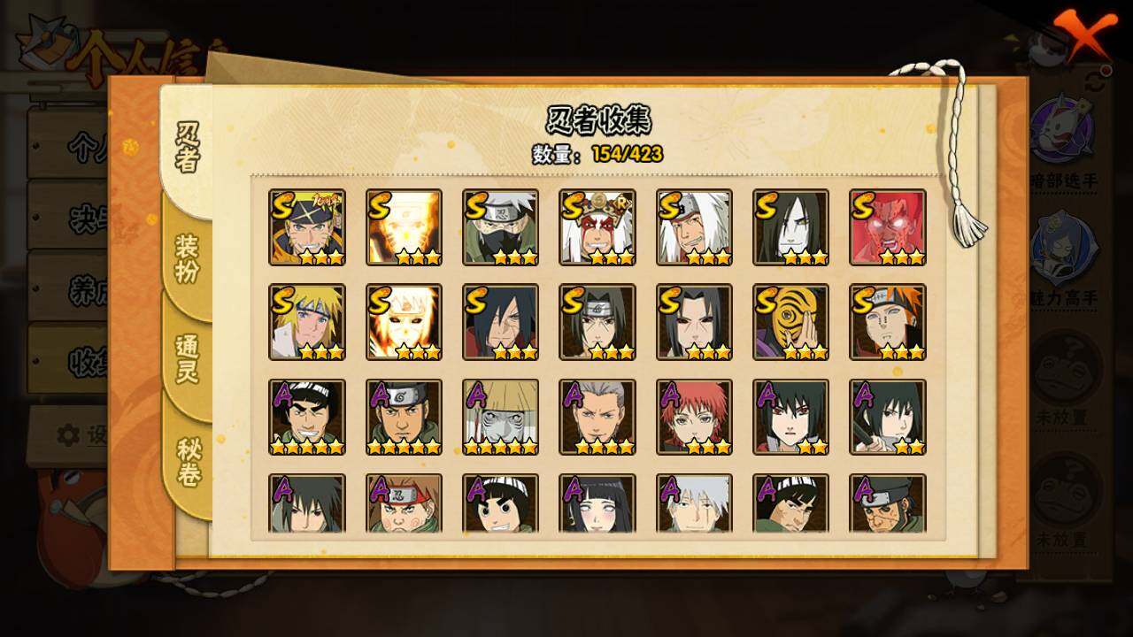 【S级忍者】:宇智波鼬「秽土转生」(3星),宇智波斑「秽土转生·解」(3星),宇智波鼬「须佐能乎」(3星),旗木卡卡西「须佐能乎」(3星),自来也「舞之豪杰」(3星),大蛇丸(3星),自来也「传说中的三忍」(3星),波风水门(3星),神秘面具男(3星),漩涡鸣人「九喇嘛连结」(3星),迈特凯「死门」(3