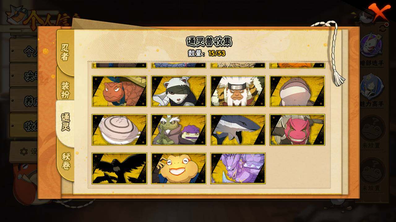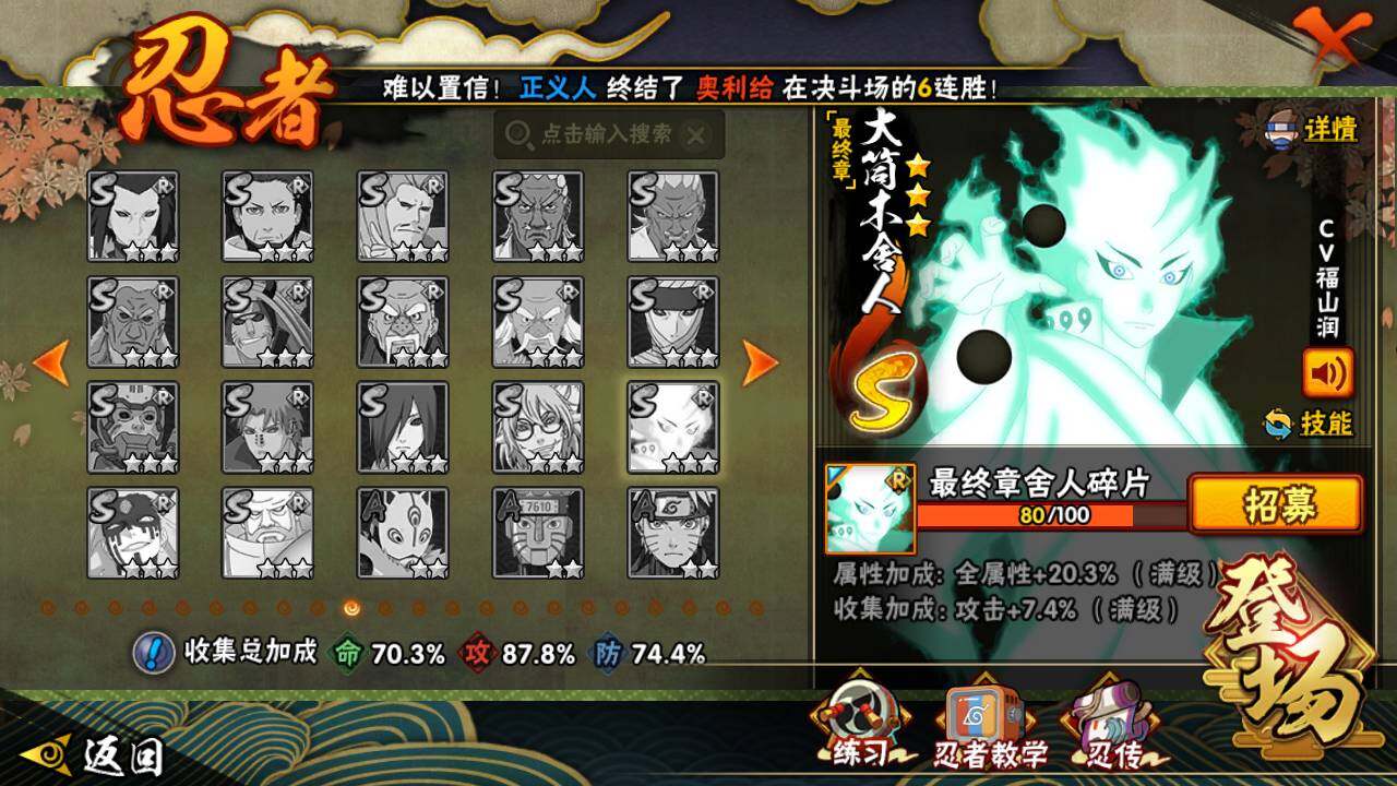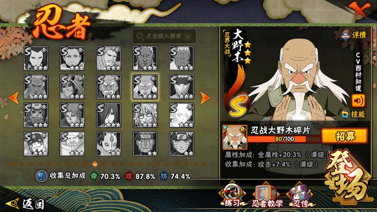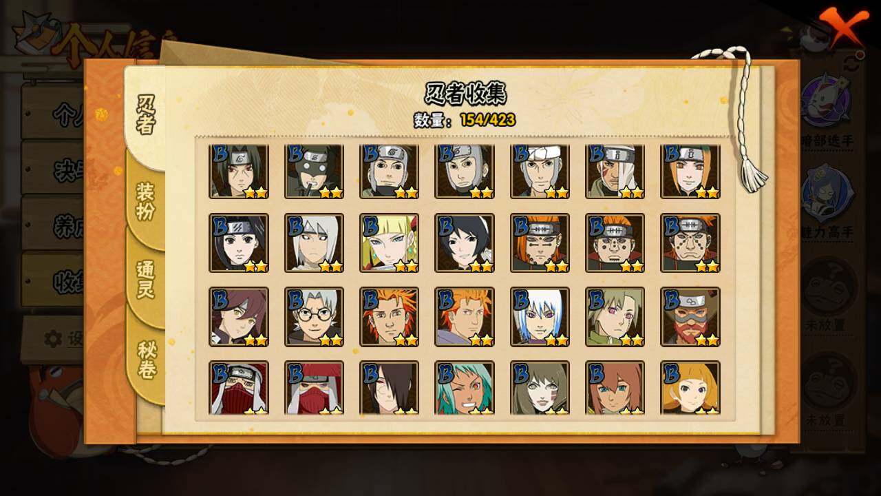 【S级忍者】:宇智波鼬「秽土转生」(3星),宇智波斑「秽土转生·解」(3星),宇智波鼬「须佐能乎」(3星),旗木卡卡西「须佐能乎」(3星),自来也「舞之豪杰」(3星),大蛇丸(3星),自来也「传说中的三忍」(3星),波风水门(3星),神秘面具男(3星),漩涡鸣人「九喇嘛连结」(3星),迈特凯「死门」(3