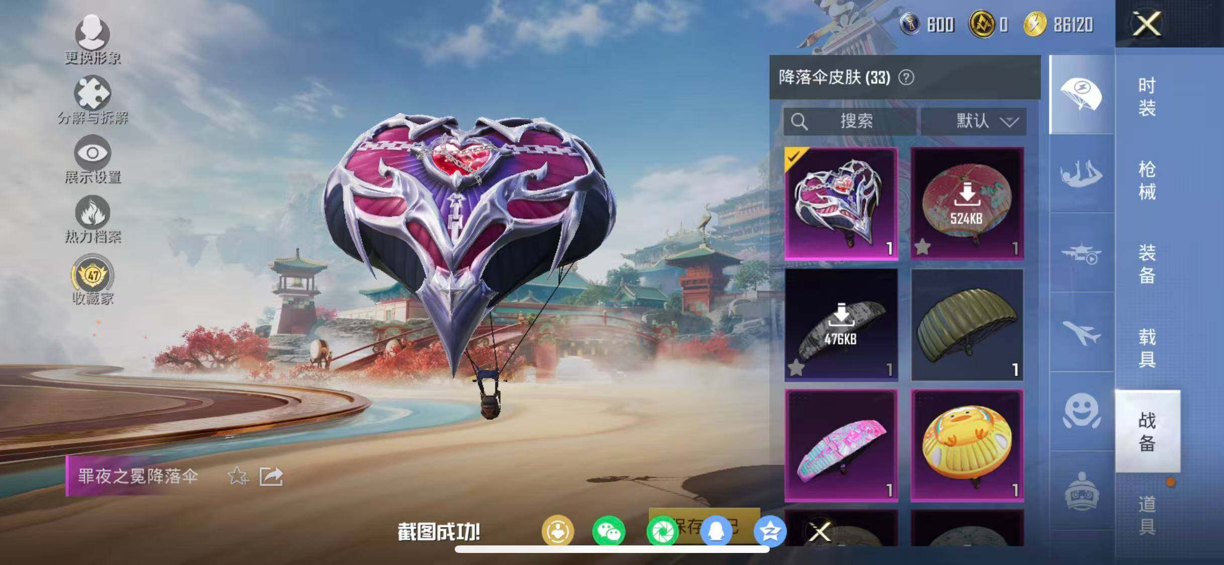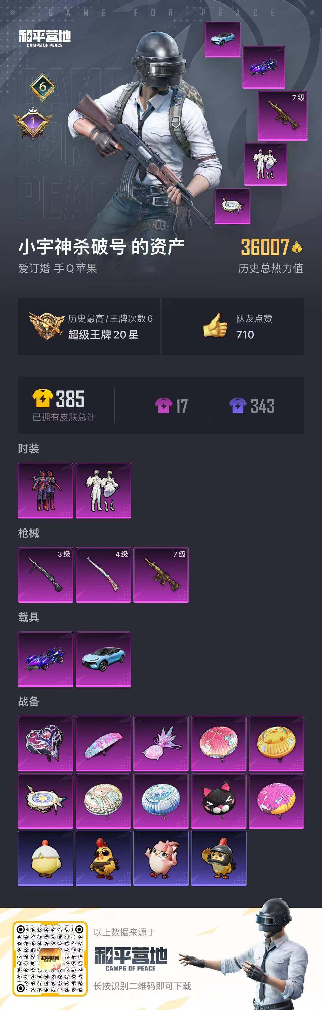 苹果 手Q-2粉装-3特效枪-2载具-2粉色飞行器-36007热力值-6王牌印记-66套装-108枪皮