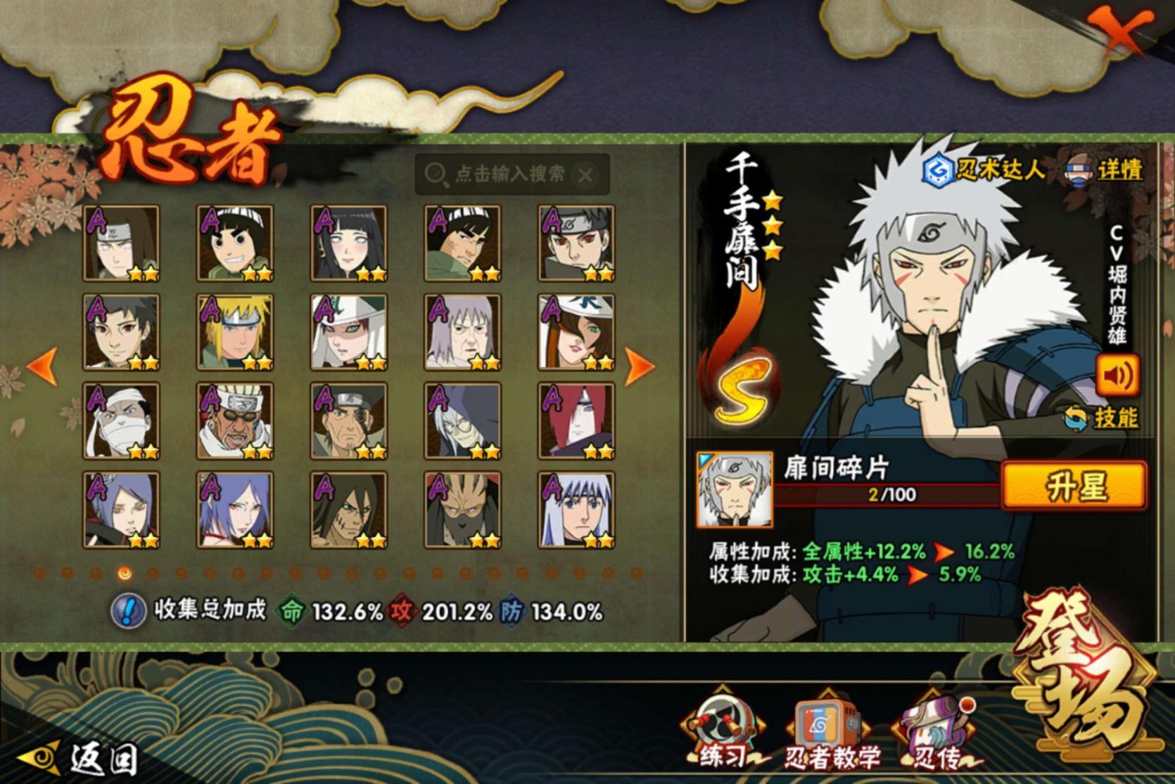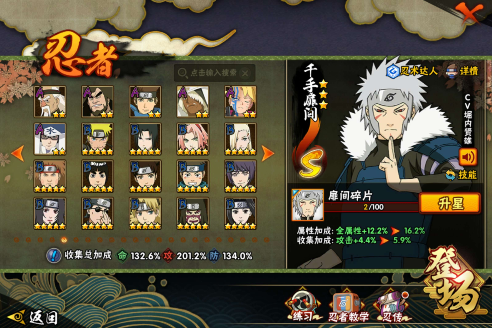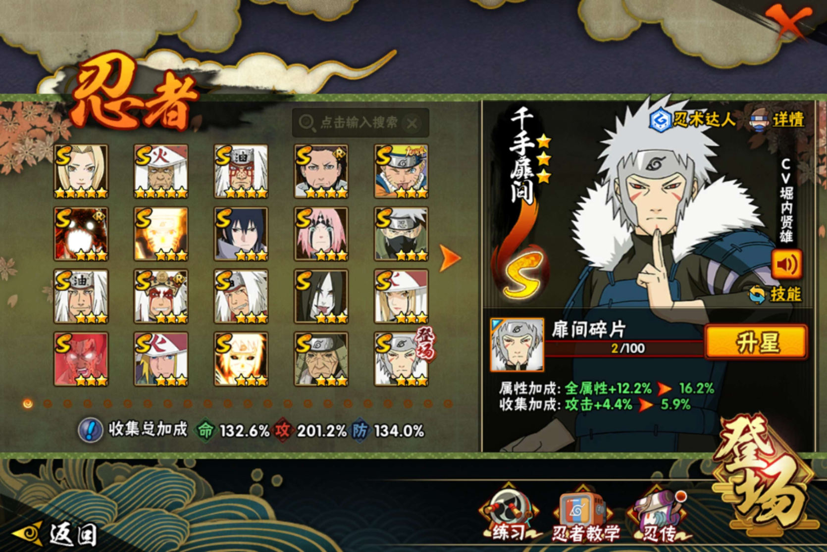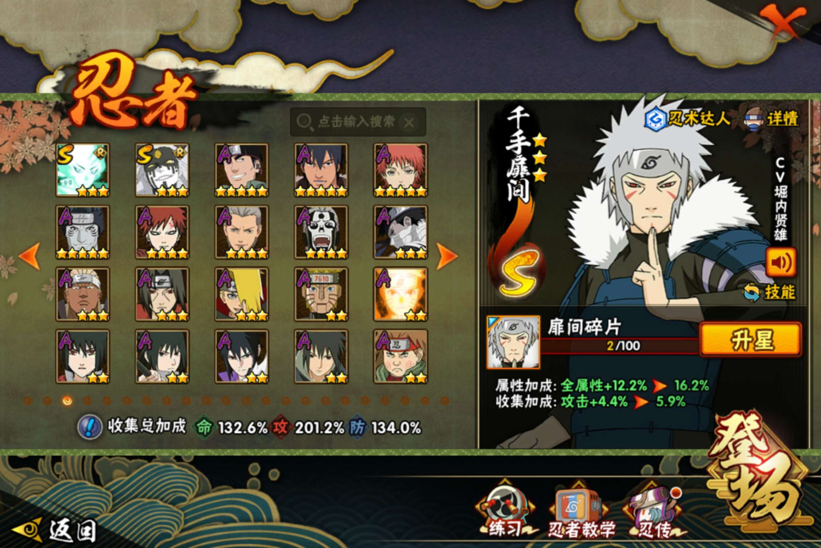 【S级忍者】宇智波带土「忍界大战」(3星),宇智波斑「木叶创立」(3星),三代目风影「秽土转生」(3星),迈特凯「死门」(3星),大野木「忍界大战」(3星),旗木卡卡西「须佐能乎」(3星),自来也「传说中的三忍」(3星),大筒木舍人「最终章」