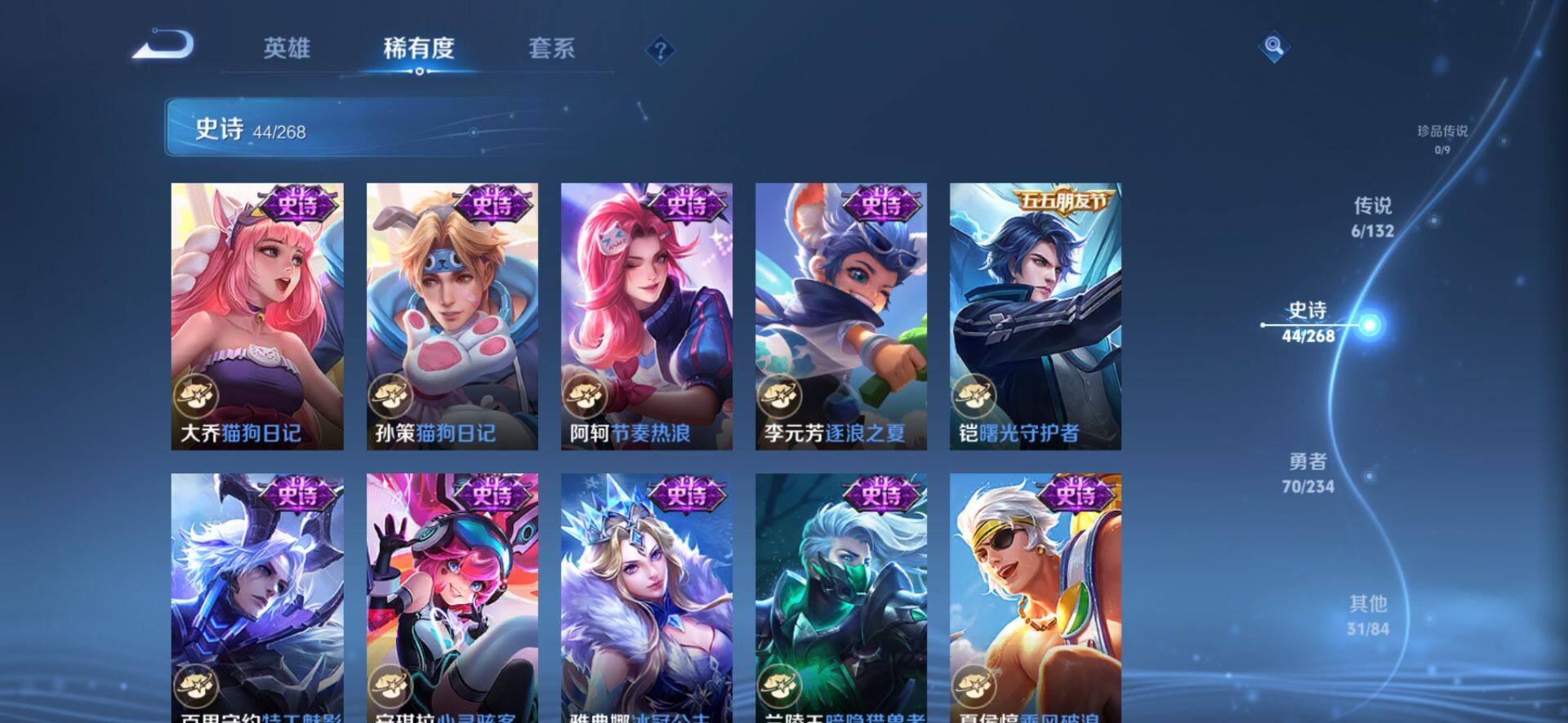 【传说皮肤】:澜愿照九州拓,云缨幻光神枪,桑启鸣野蒿,达摩黄金狮子座,后羿黄金射手座,宫本武藏地狱之眼