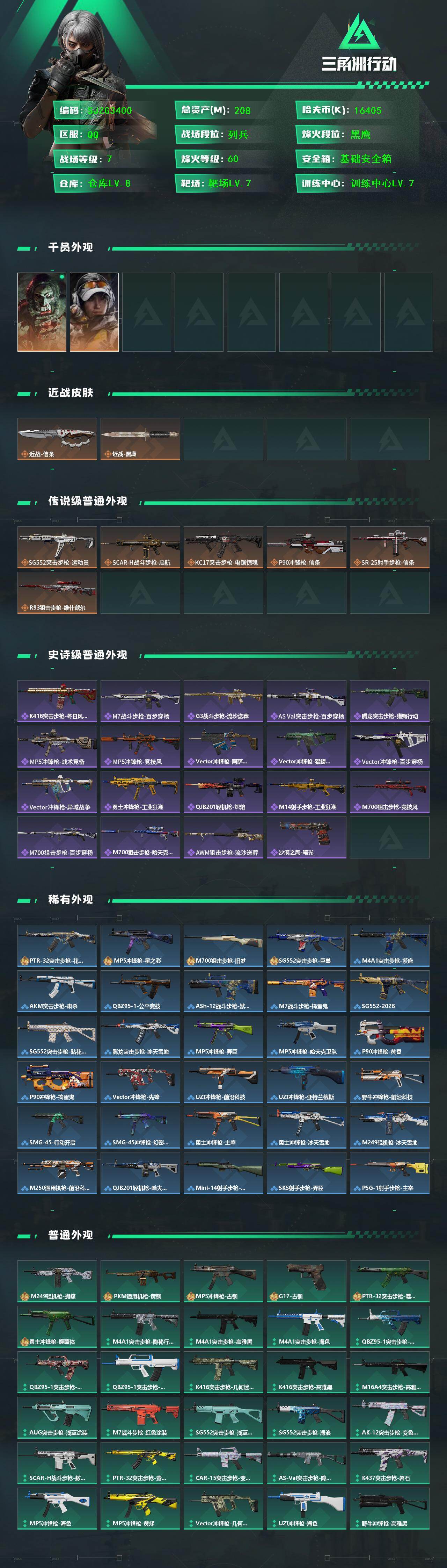 总资产(M):208M/哈夫币(K):16405K/传说枪皮数:6/全面战场等级:7_段位:列兵/烽火地带等级:60_段位:黑鹰