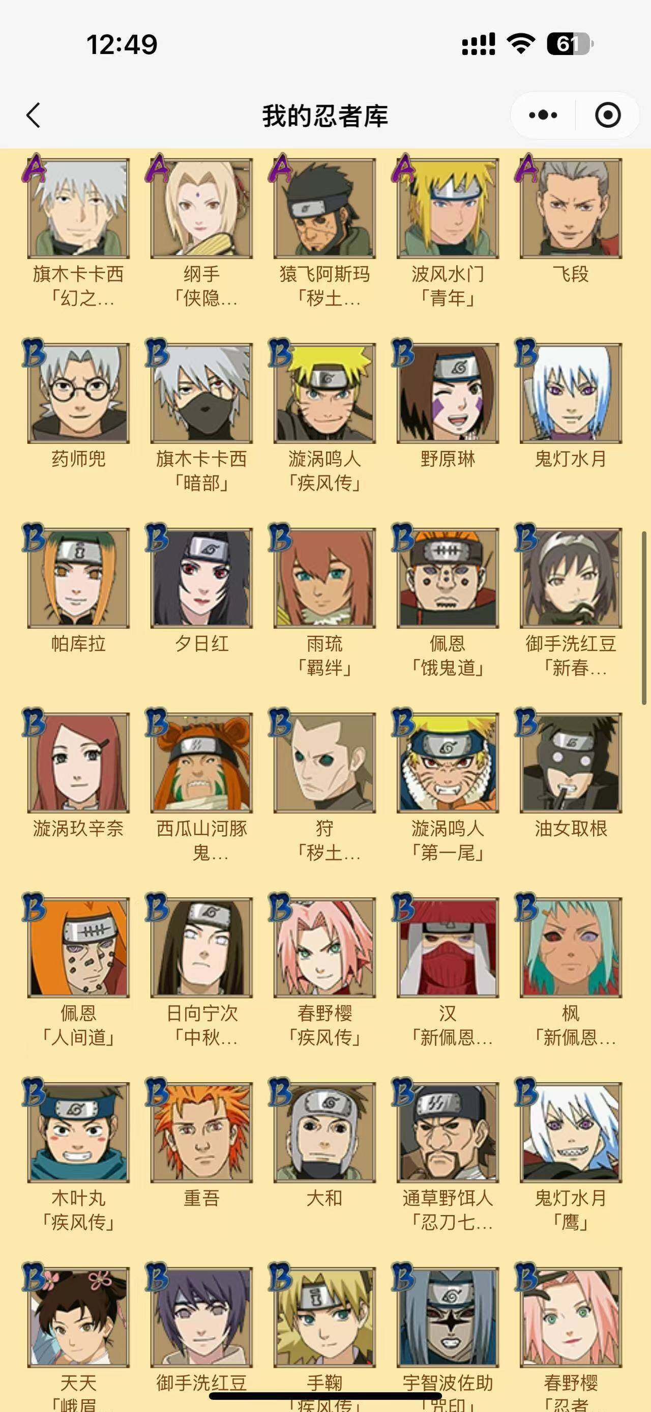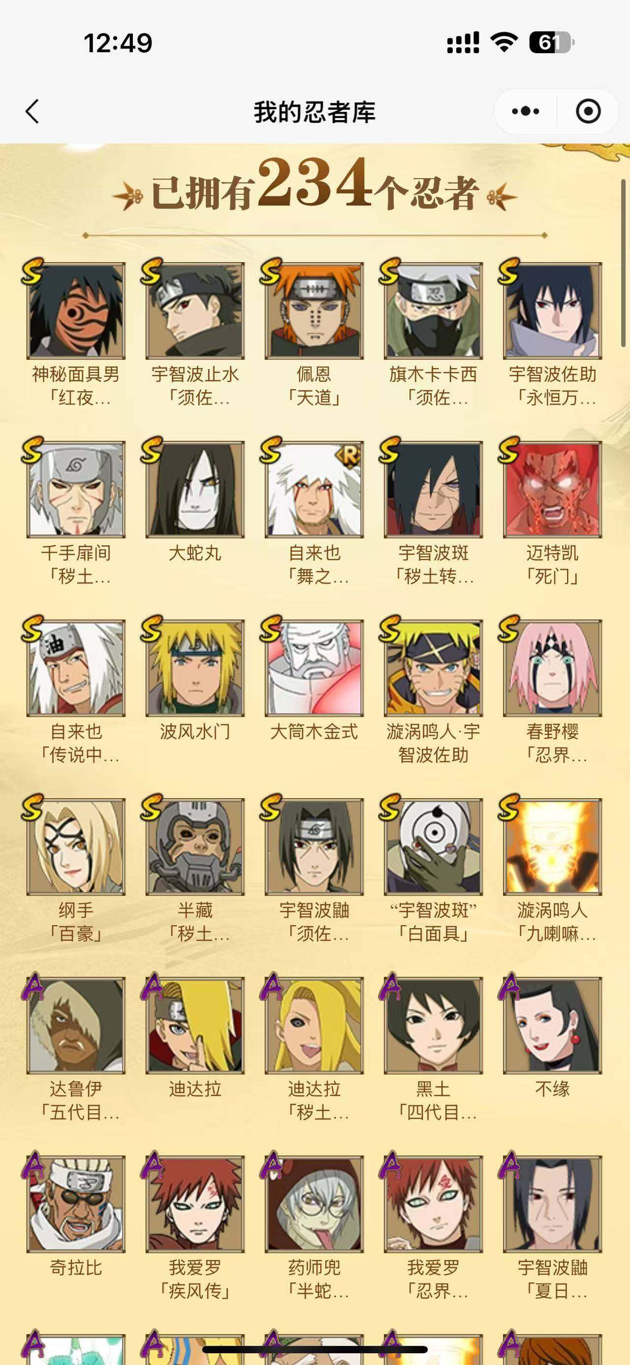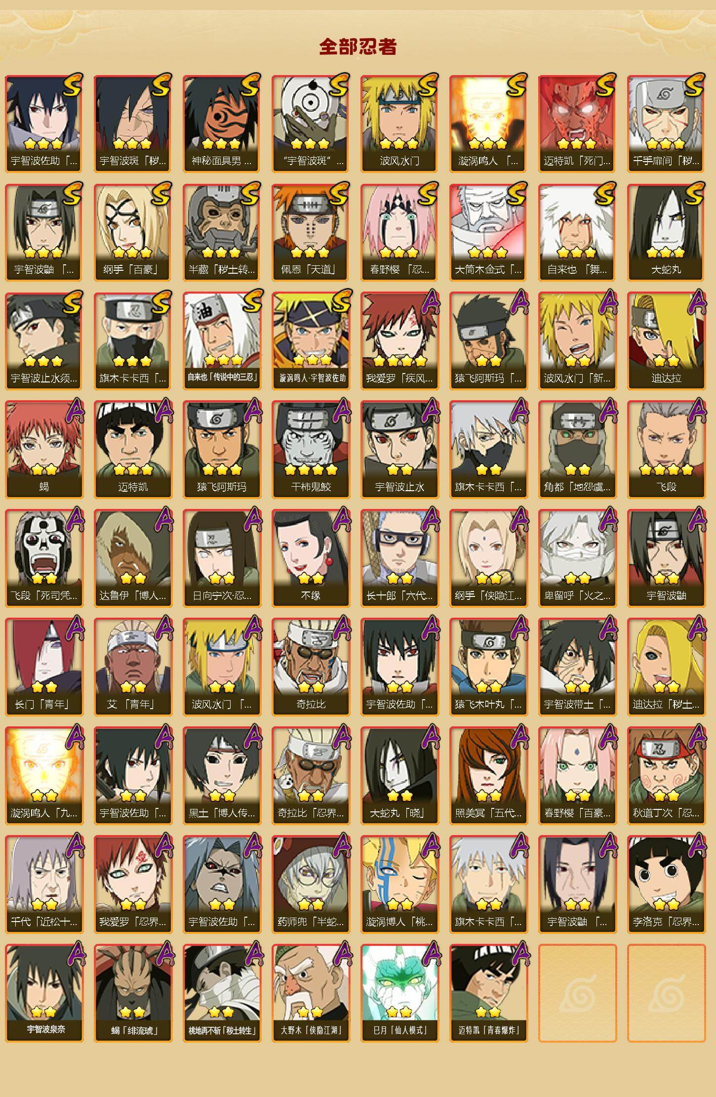 【S级忍者】:半藏「秽土转生」(3星),千手扉间「秽土转生」(3星),宇智波斑「秽土转生·解」(3星),春野樱「忍界大战」(3星),宇智波鼬「须佐能乎」(3星),宇智波止水「须佐能乎」(3星),旗木卡卡西「须佐能乎」(3星),自来也「舞之豪杰」(3星),大蛇丸(3星),自来也「传说中的三忍」(3星),纲手「百豪」(3星),波风水门(3星),神秘面具男「红夜之刃」(