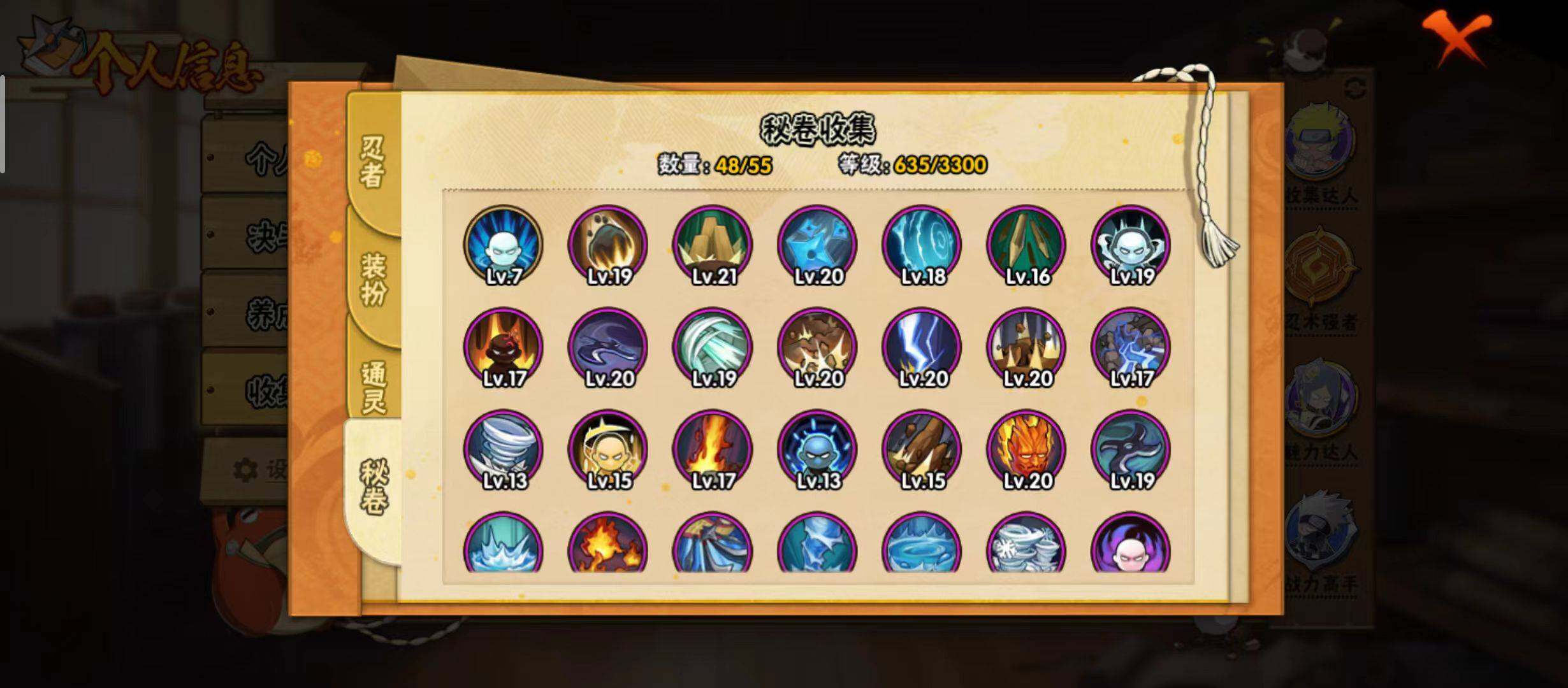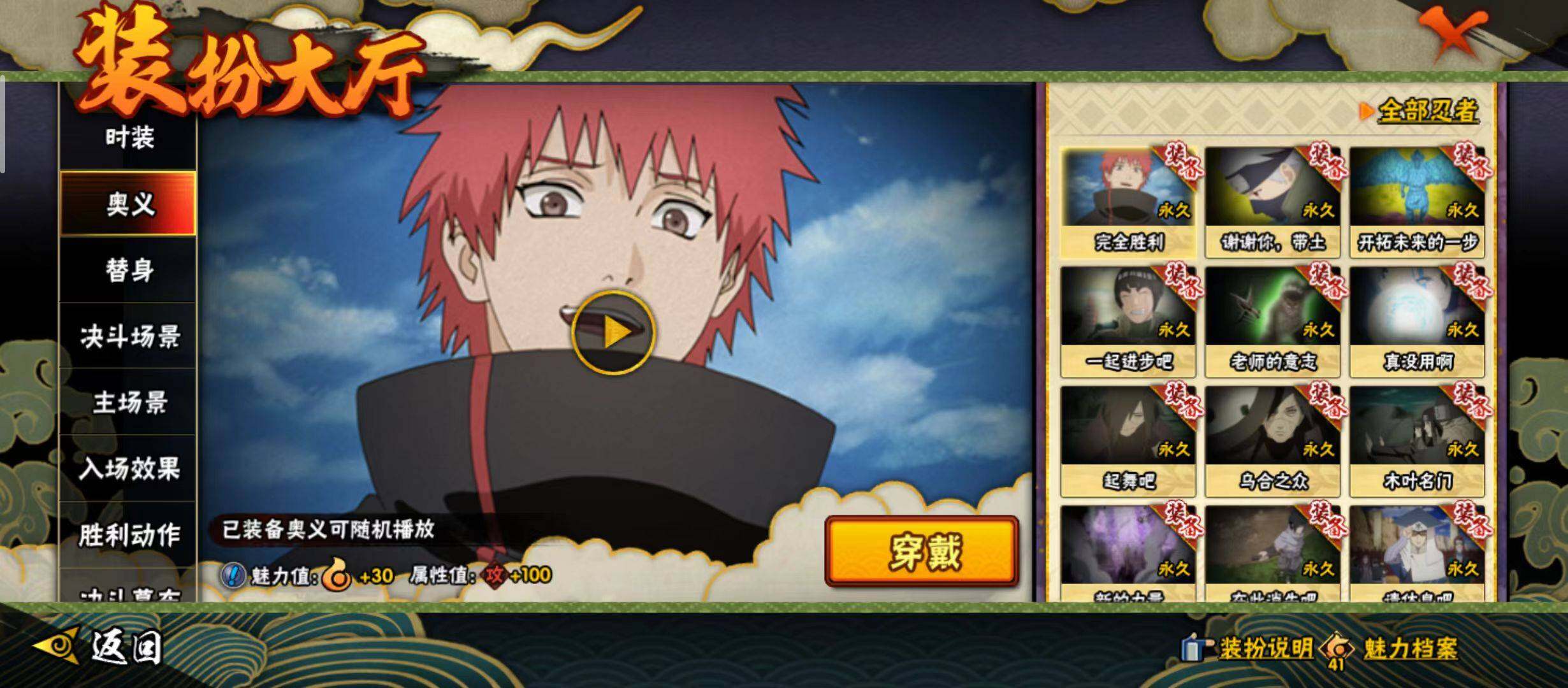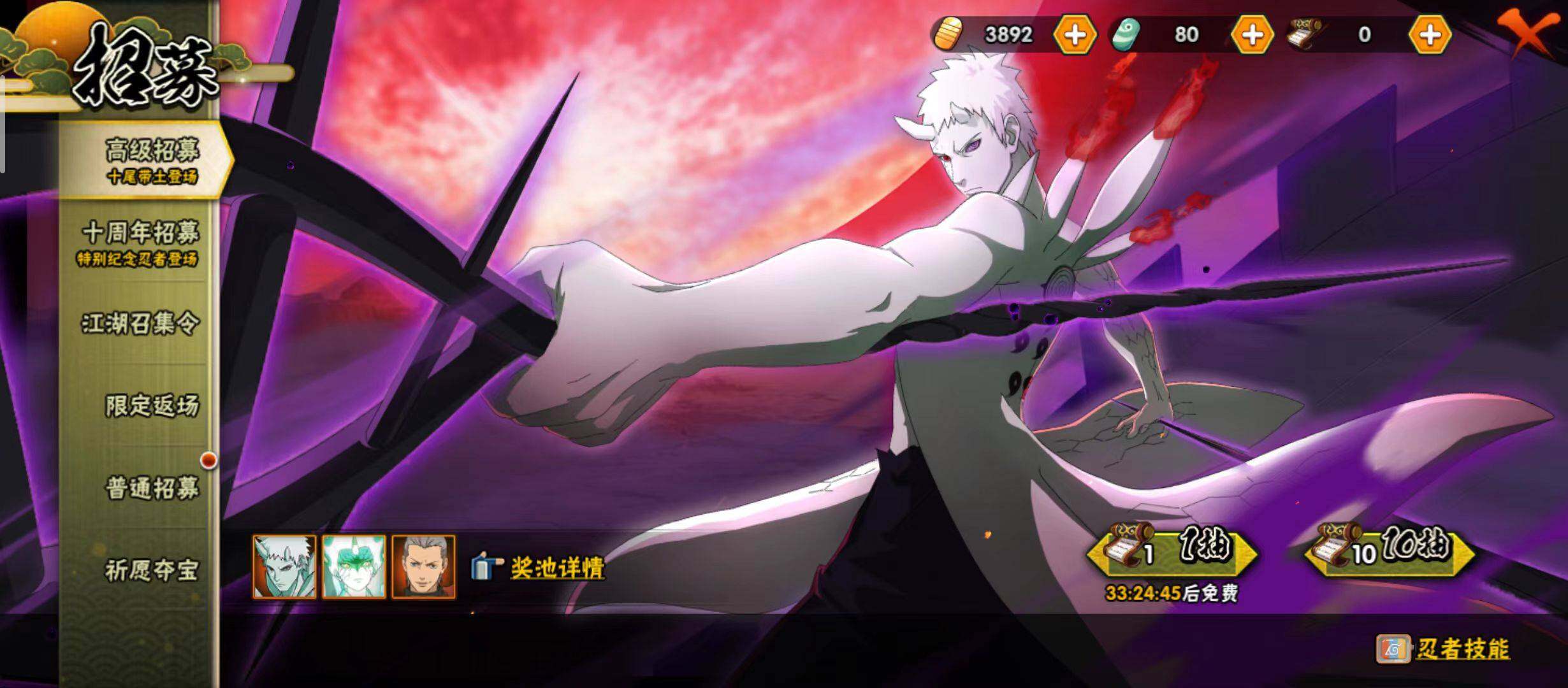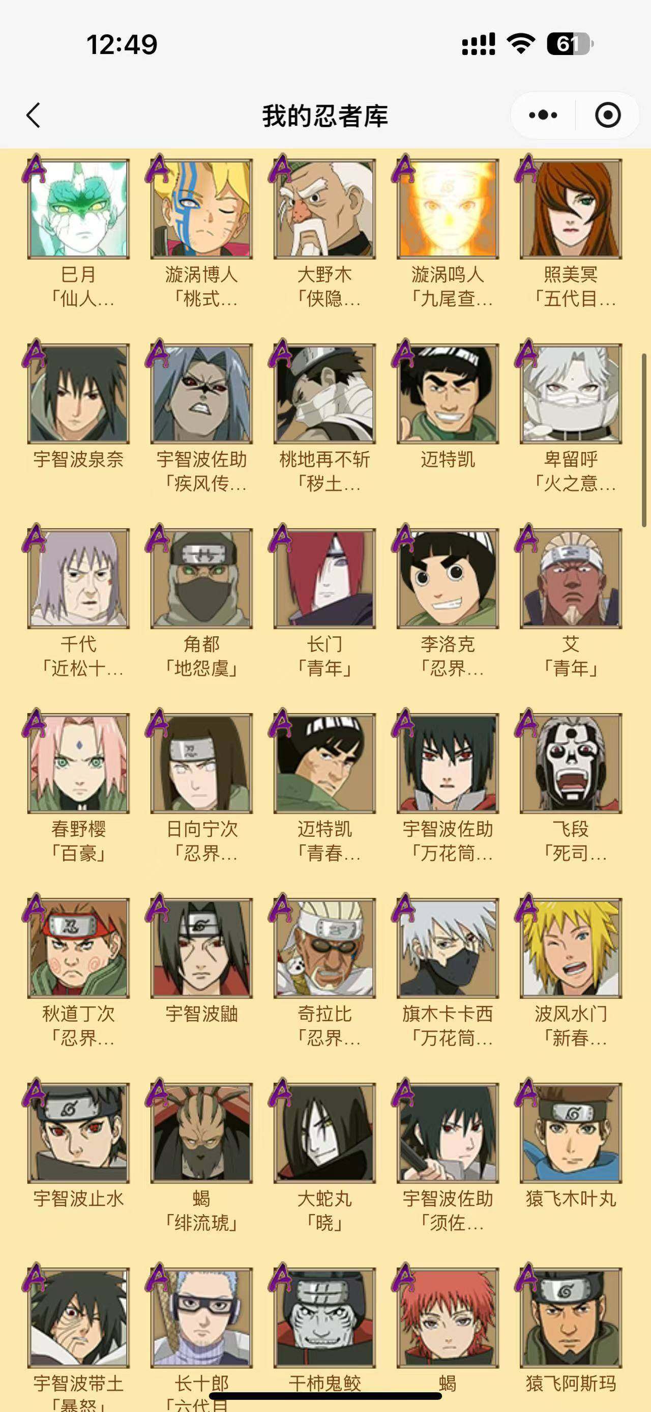 【S级忍者】:半藏「秽土转生」(3星),千手扉间「秽土转生」(3星),宇智波斑「秽土转生·解」(3星),春野樱「忍界大战」(3星),宇智波鼬「须佐能乎」(3星),宇智波止水「须佐能乎」(3星),旗木卡卡西「须佐能乎」(3星),自来也「舞之豪杰」(3星),大蛇丸(3星),自来也「传说中的三忍」(3星),纲手「百豪」(3星),波风水门(3星),神秘面具男「红夜之刃」(
