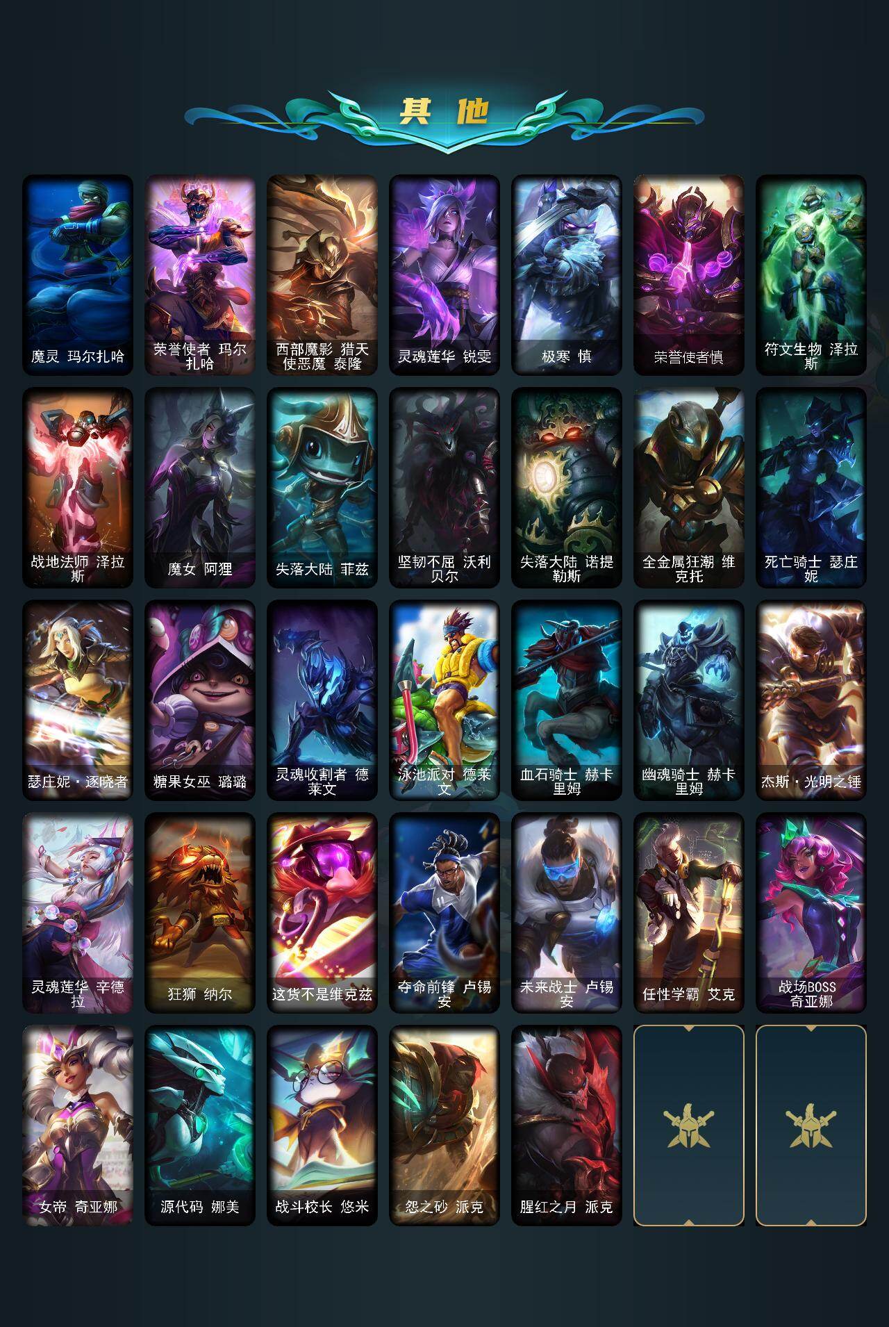 172英雄/197皮肤/1终极/3神话/32限定/7臻彩/29炫彩/17传说/47史诗/未定级/