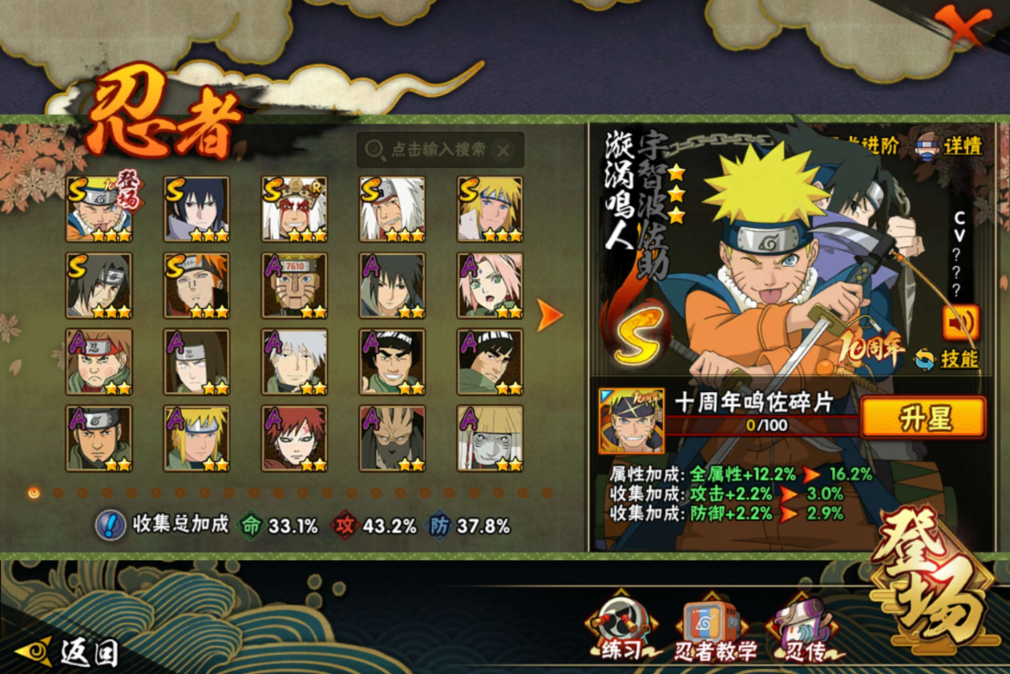 【S级忍者】自来也「传说中的三忍」(3星),宇智波佐助「永恒万花筒」(3星),自来也「舞之豪杰」(3星),宇智波鼬「须佐能乎」(3星),漩涡鸣人·宇智波佐助(3星),佩恩「天道」(3星),波风水门(3星),