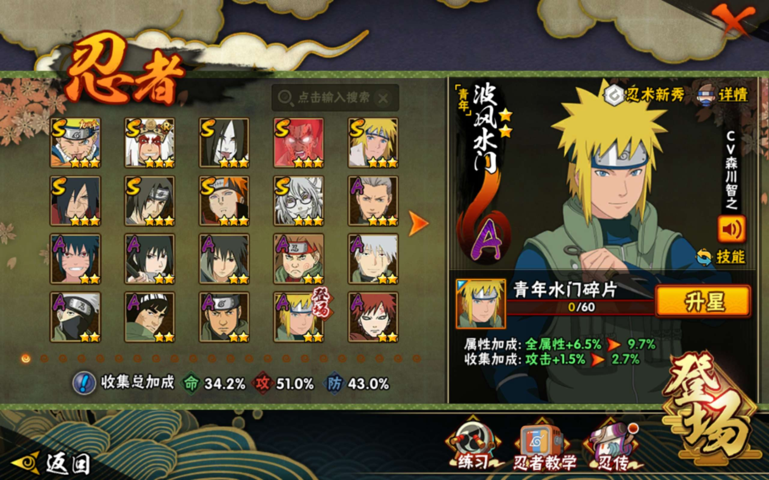 【S级忍者】迈特凯「死门」(3星),宇智波斑「秽土转生·解」(3星),药师兜「仙人模式」(3星),自来也「舞之豪杰」(3星),宇智波鼬「须佐能乎」(3星),漩涡鸣人·宇智波佐助(3星),佩恩「天道」(3星),波风水门(3星),大蛇丸(3星),