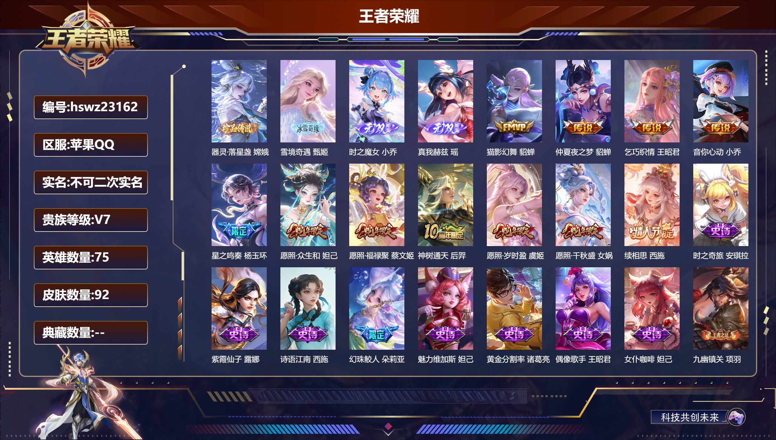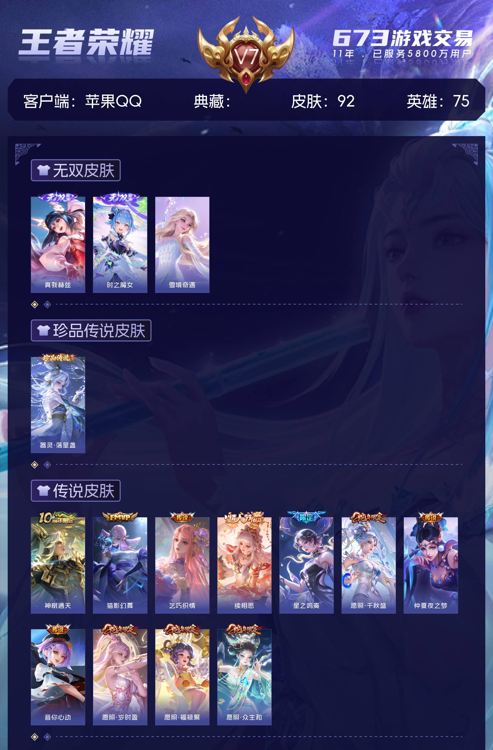 苹果QQ/至尊星耀/92皮肤/75英雄/0典藏/0珍品无双/3无双/1珍品传说/11传说/29史诗/