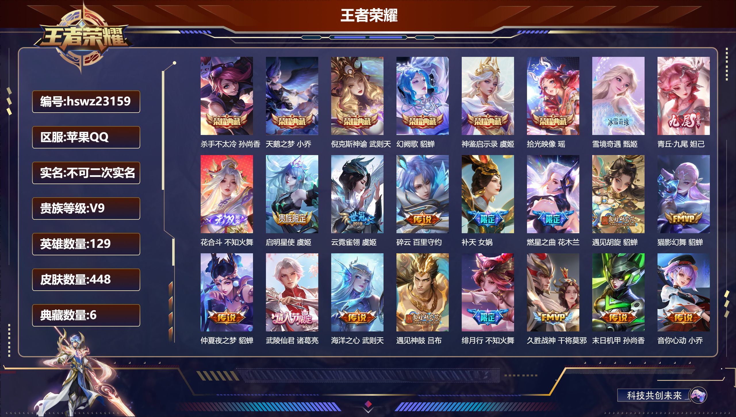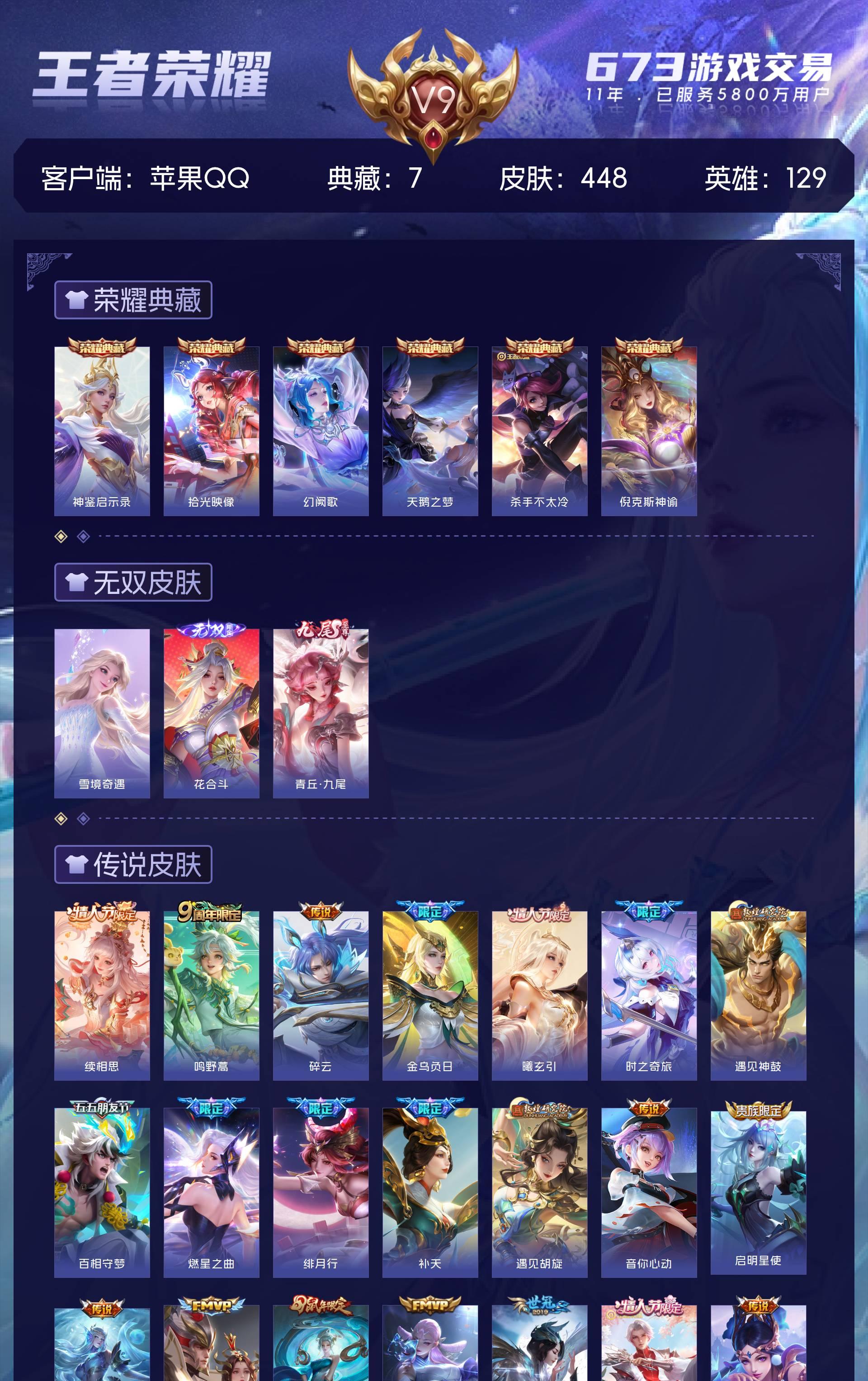 苹果QQ/最强王者/448皮肤/129英雄/6典藏/0珍品无双/3无双/0珍品传说/23传说/132