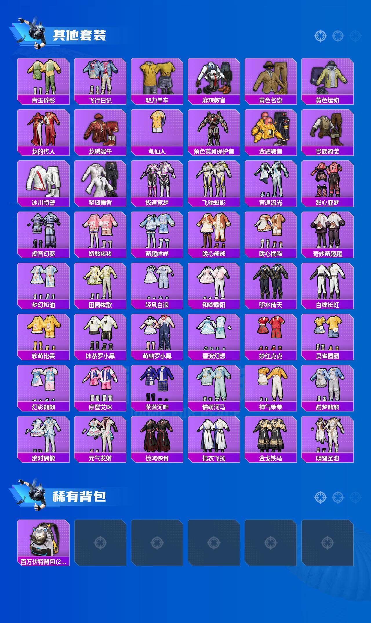 【粉色套装】:粉装-朗月武圣,粉装-旋转彩虹,粉装-碧穹智者,粉装-银红美神,粉装-光明术士,粉装-海螺星光,粉装-音爆索尼克,粉装-仲夏莫吉托,角色-幻影,角色-猩猩队长,粉装-闲梦青缨